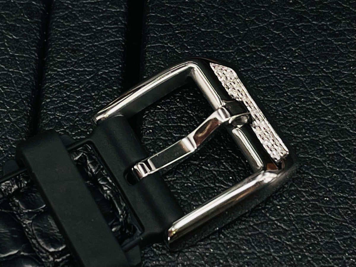 精鑲鑽圈、滿天星鑽石面盤、不鏽鋼材質錶殼、穿扣 / 夜光指針 / 立體阿拉伯數字時標 / 原廠黑色錶帶 / 藍寶石水晶玻璃鏡面