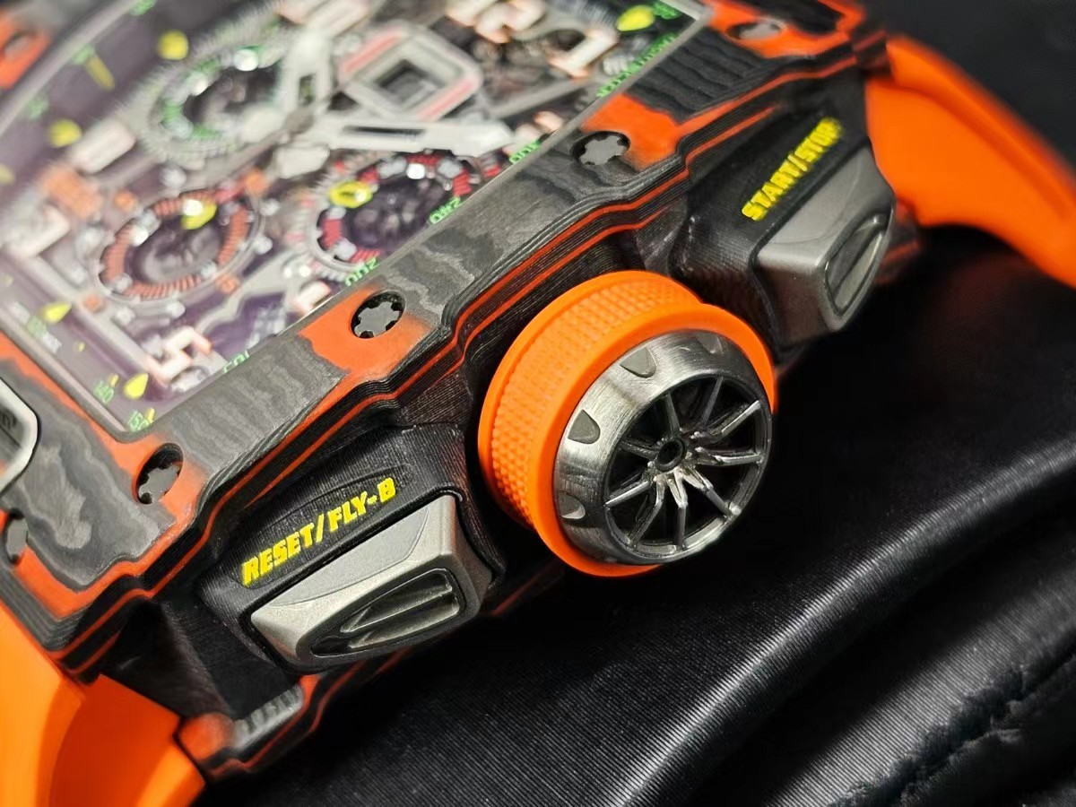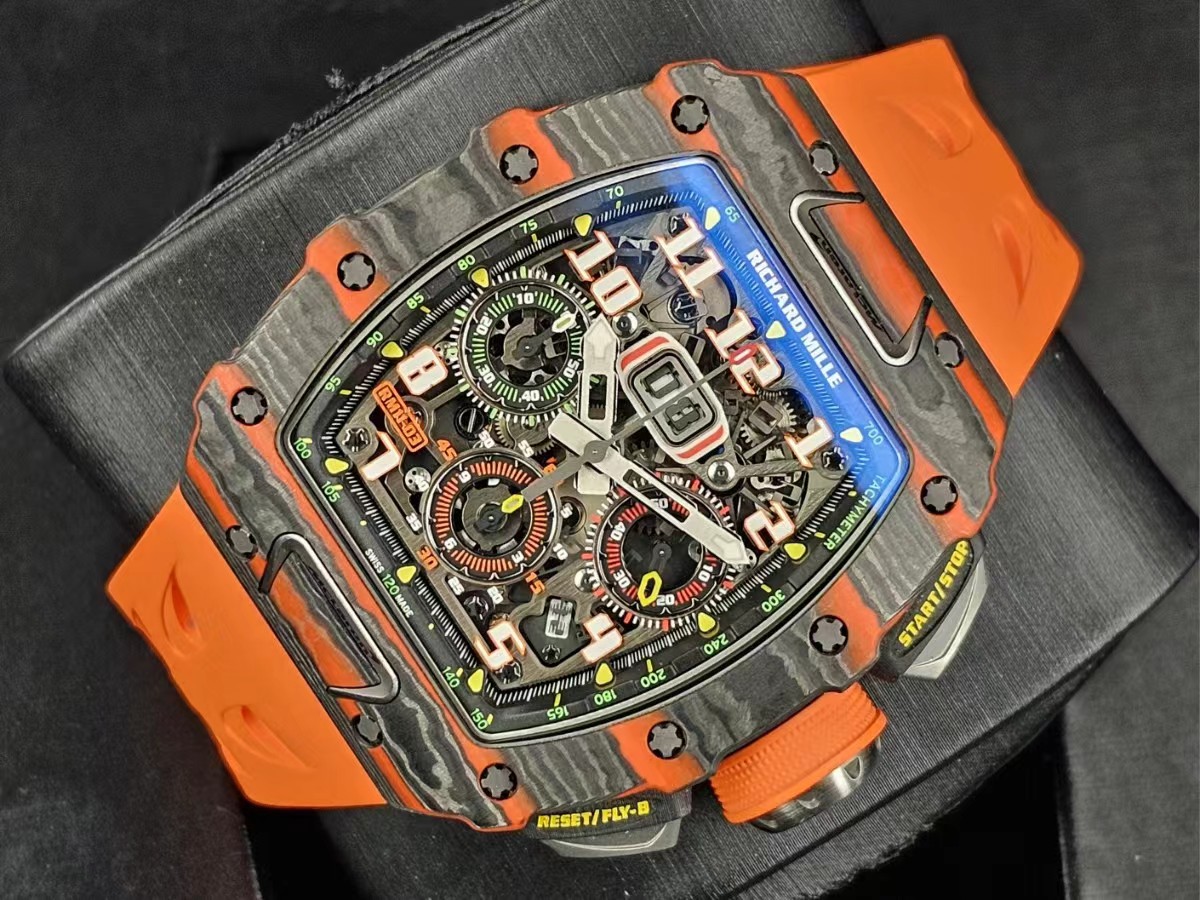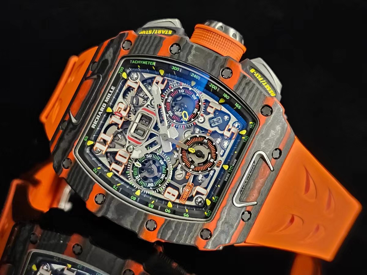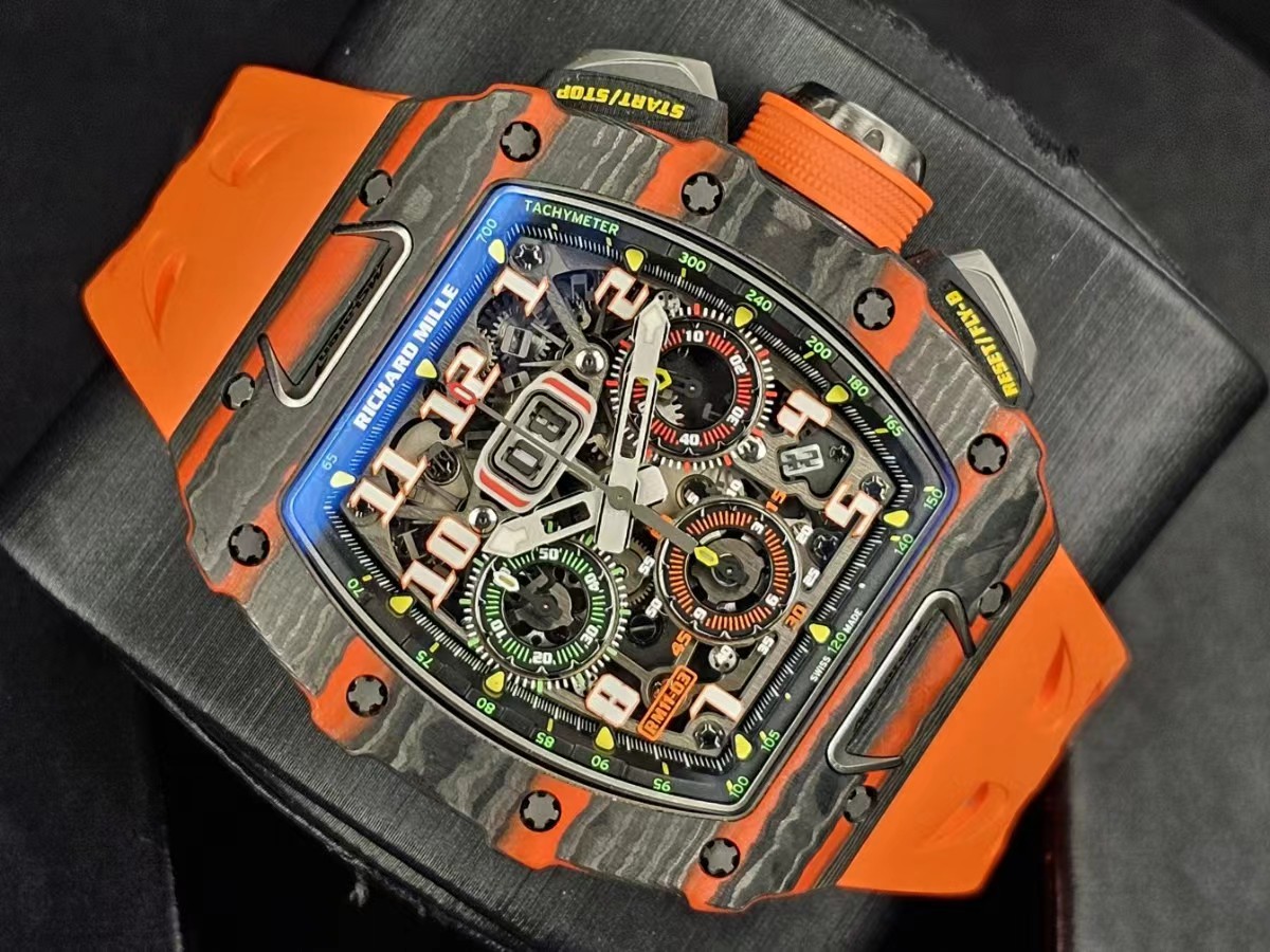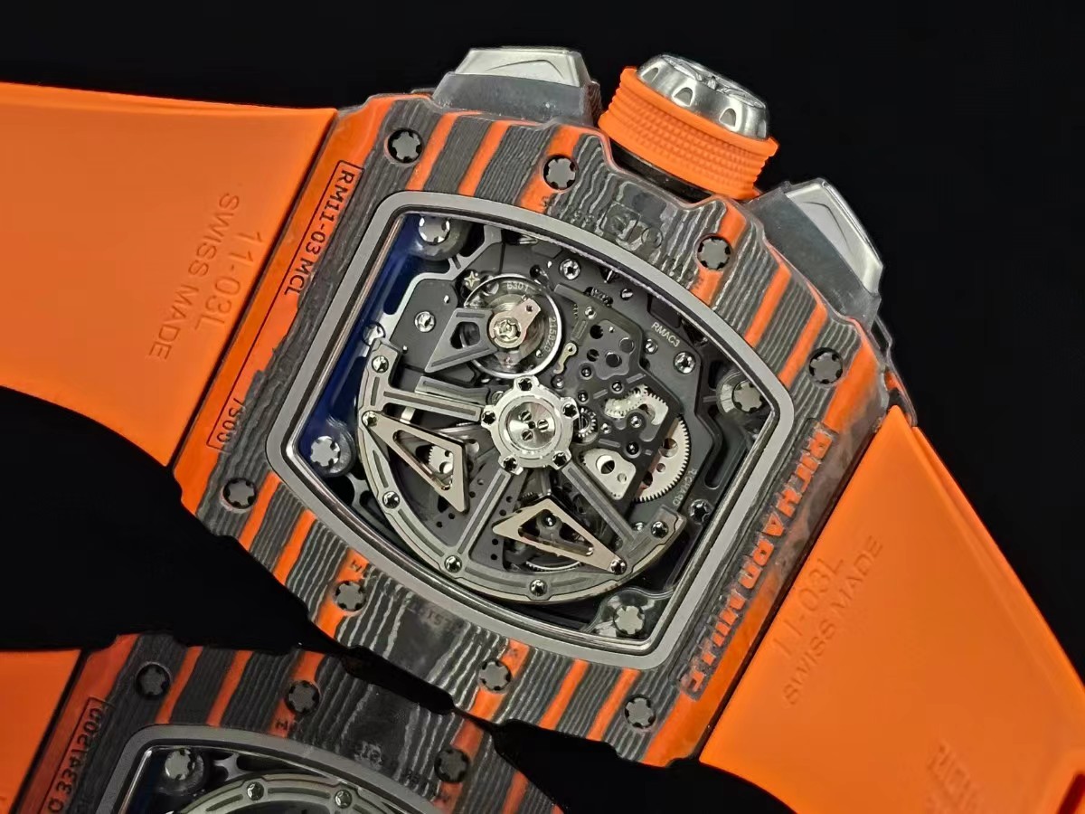 RM 11-03的設計靈感來自邁凱倫720S,錶殼使用橙色TPT石英纖維,與邁拉輪經典超跑的顏色一致。表圈帶有邁拉輪標誌,形狀與邁拉輪F1賽車的進氣管相似。鈦合金計時按鈕猶如邁拉輪720S獨特的前大燈,表冠的形狀就像邁拉輪輕量化輪轂。膠帶上刻有邁拉輪Speedmark標誌。該腕錶採用型號為RMAC3的機芯,具有年曆顯示、12小時累積計時及倒數計時顯示功能,可提供55小時動力儲備。