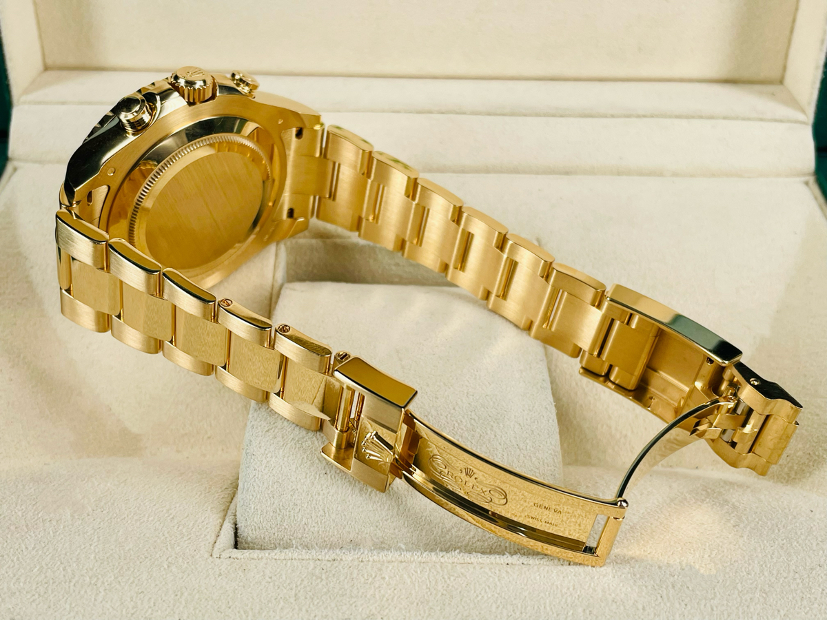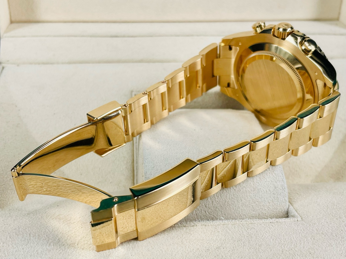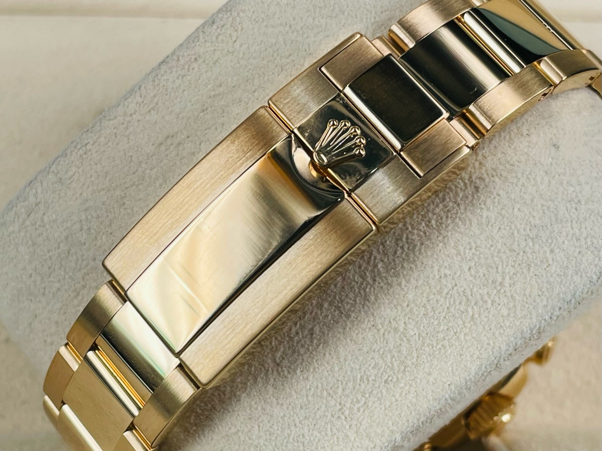 18K黃金材質錶殼、錶帶、摺疊扣 / 白色面盤、CHROMALIGHT(持久夜光黃K金指針、時標 / 黃K金材質旋轉錶圈,旋入式錶冠 / 抗磨損藍寶石水晶玻璃 / 防偽內圈