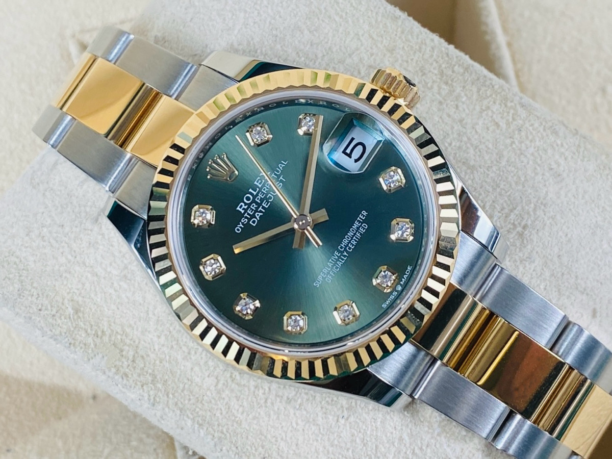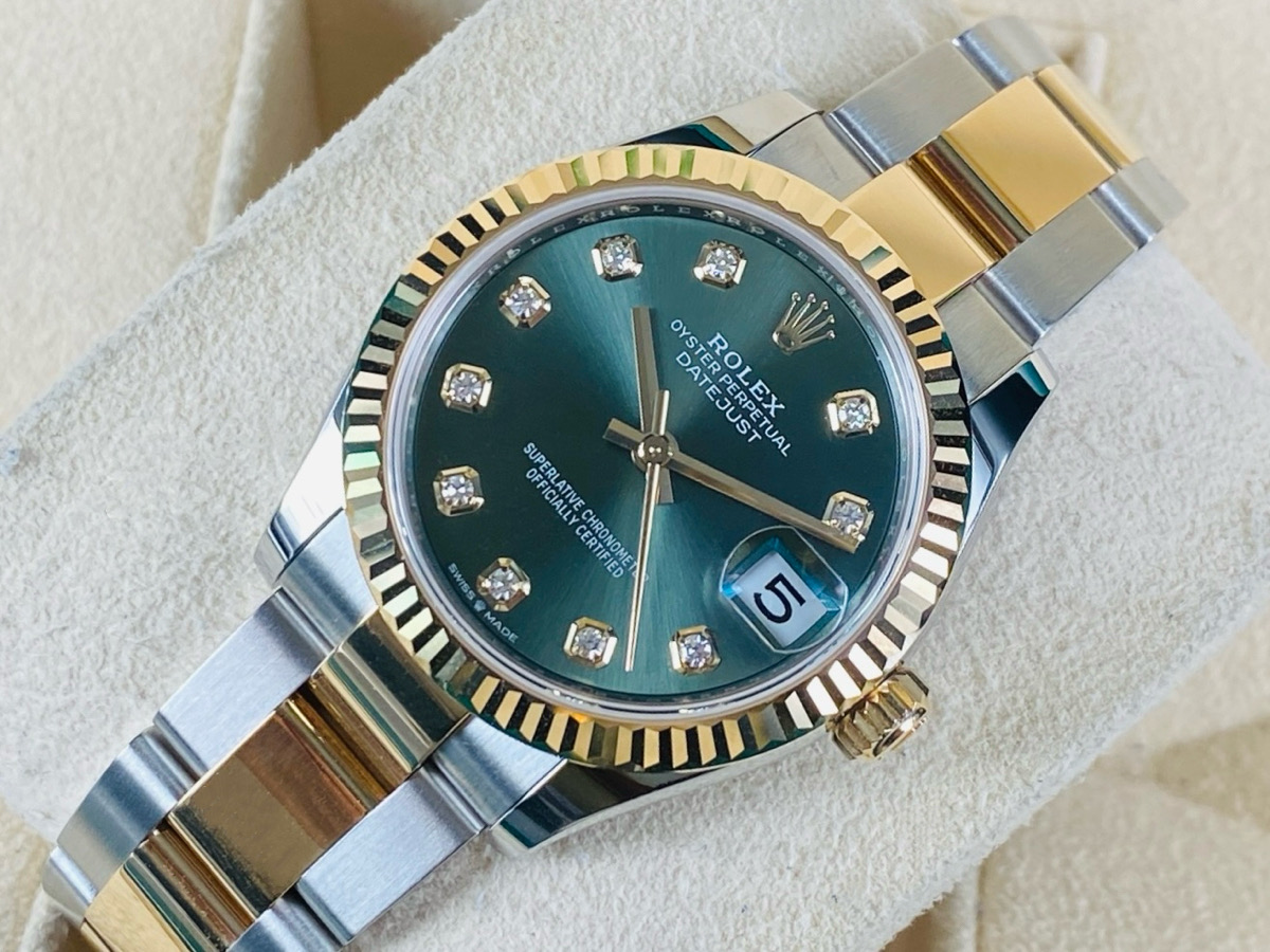 鑲鑽橄欖綠色錶面 原鑲鑽石時標 氣質出眾 三版錶帶
