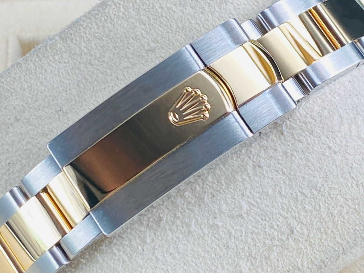黃K金搭配不鏽鋼材質錶殼、錶鍊帶及原廠折疊帶扣 / 旋入式錶冠 / 藍寶石水晶玻璃鏡面 / 防偽內圈