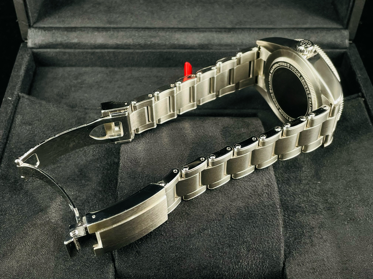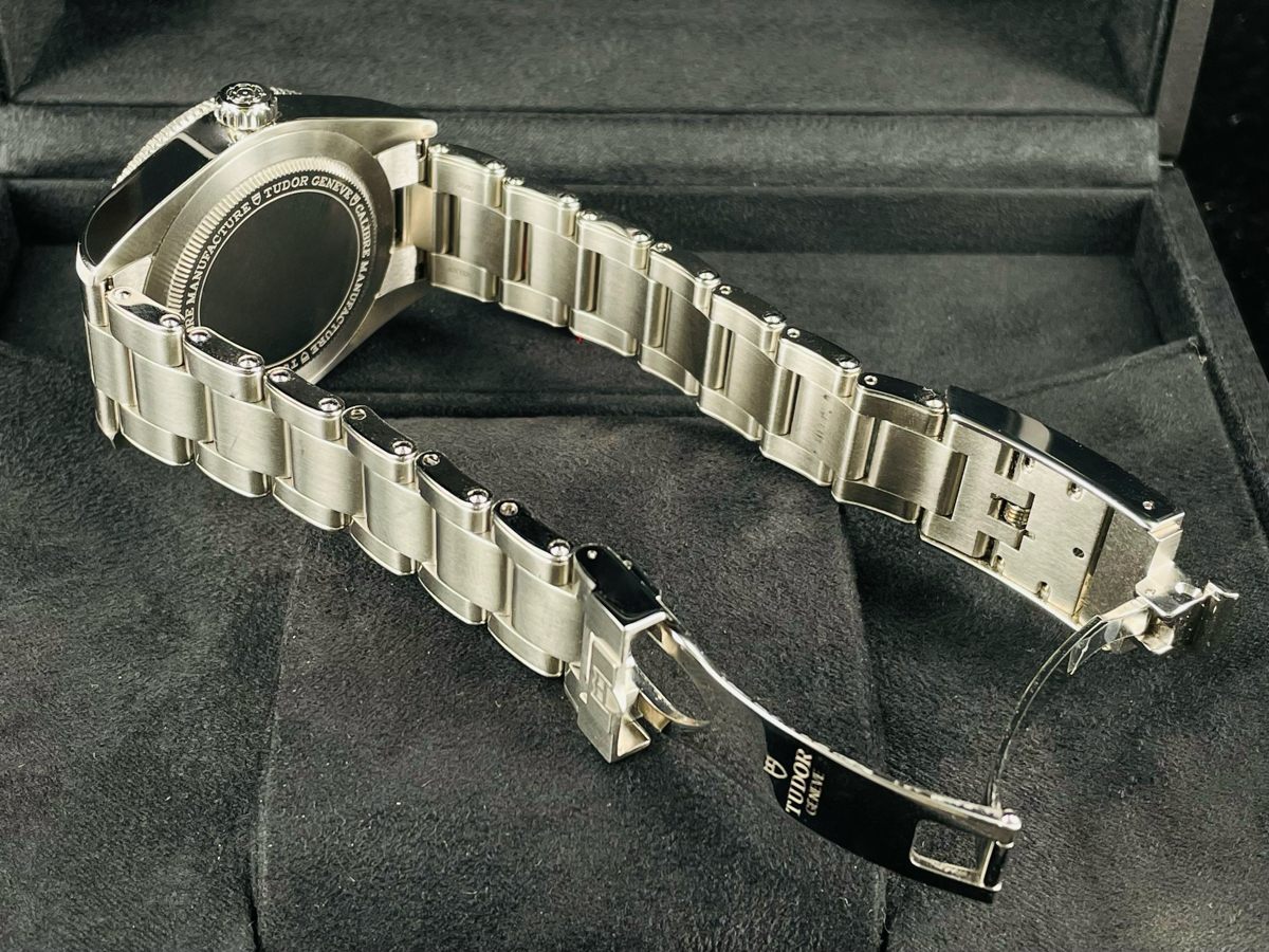 磨光及磨砂不銹鋼錶殼 / 不銹鋼旋入式錶冠 浮雕帝舵表玫瑰標誌 / 不銹鋼三鏈節「鉚釘」錶帶 / 帝舵表「T-fit」帶扣 / 圓拱形藍水晶鏡面
