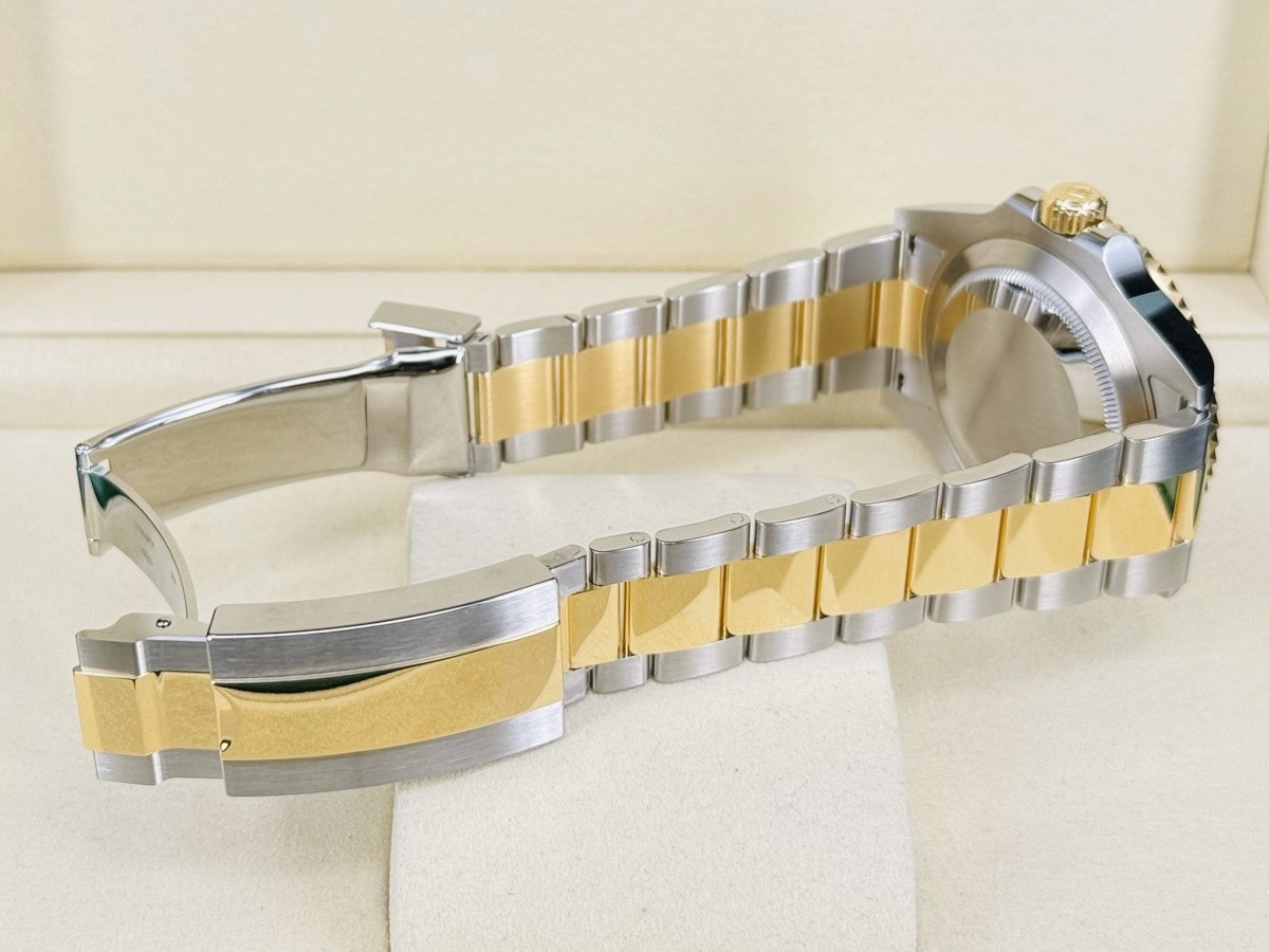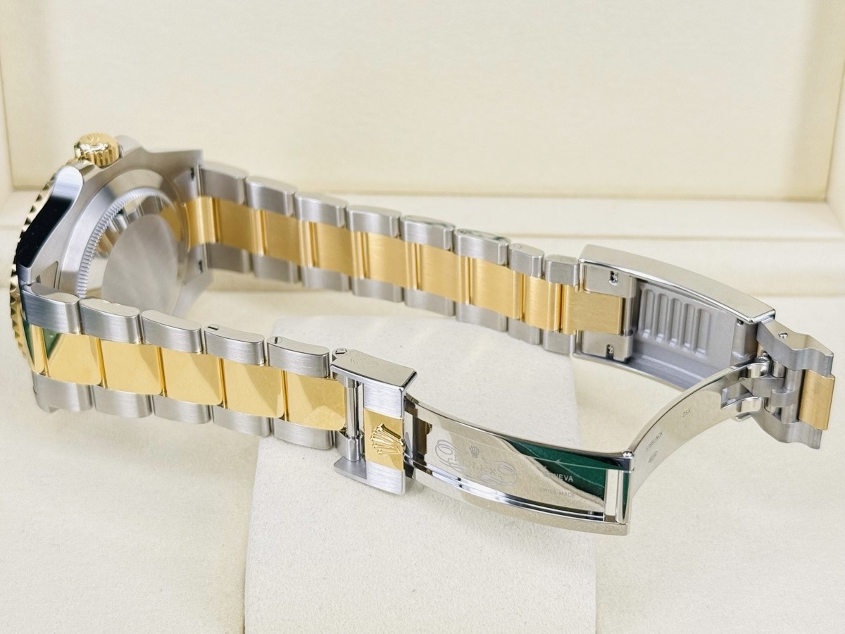 904L精鋼+18K黃金材質錶殼、錶帶、快調式摺疊扣 / 黑色面盤 / 夜光賓士指針、時標 / Cerachrom藍色陶瓷單向旋轉錶圈 / 旋入式錶冠 / 抗磨損藍寶石水晶玻璃 / 防偽內圈
