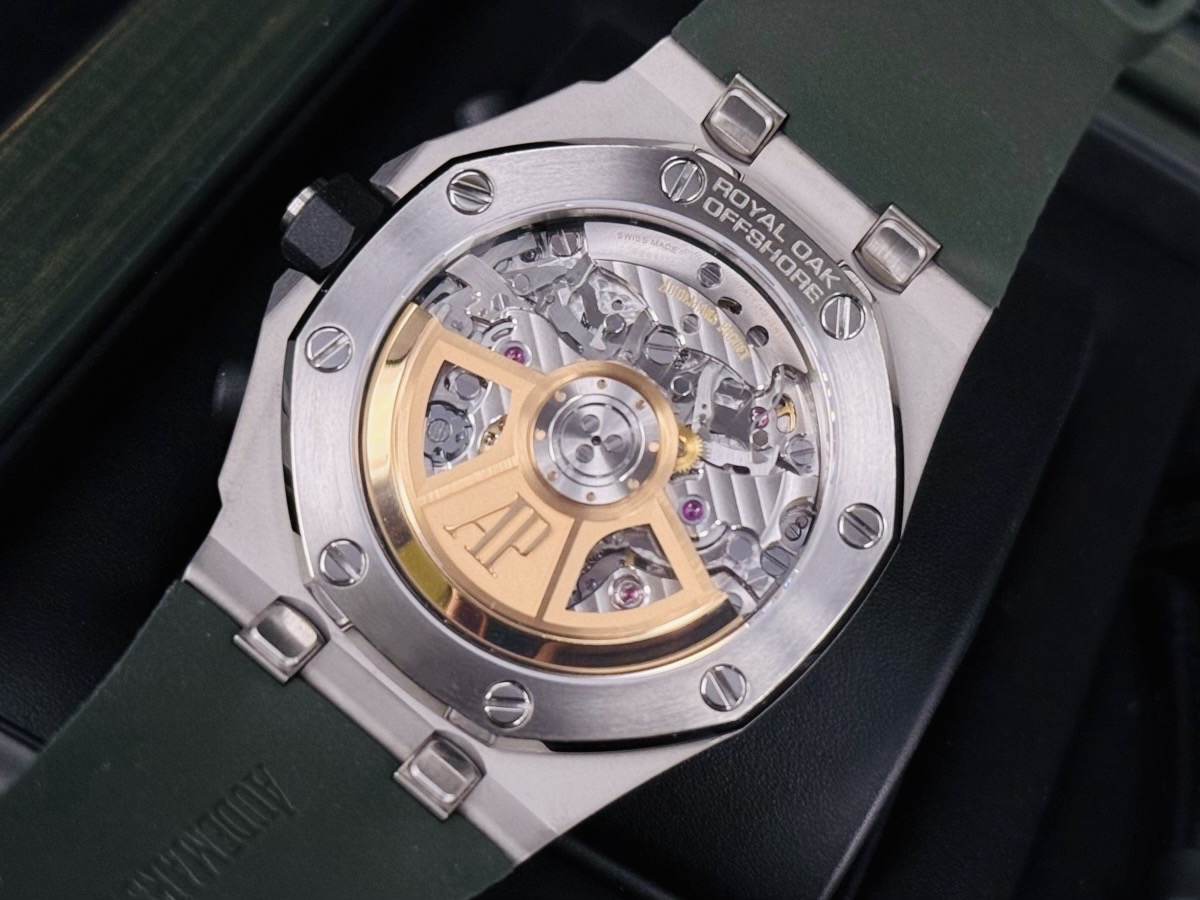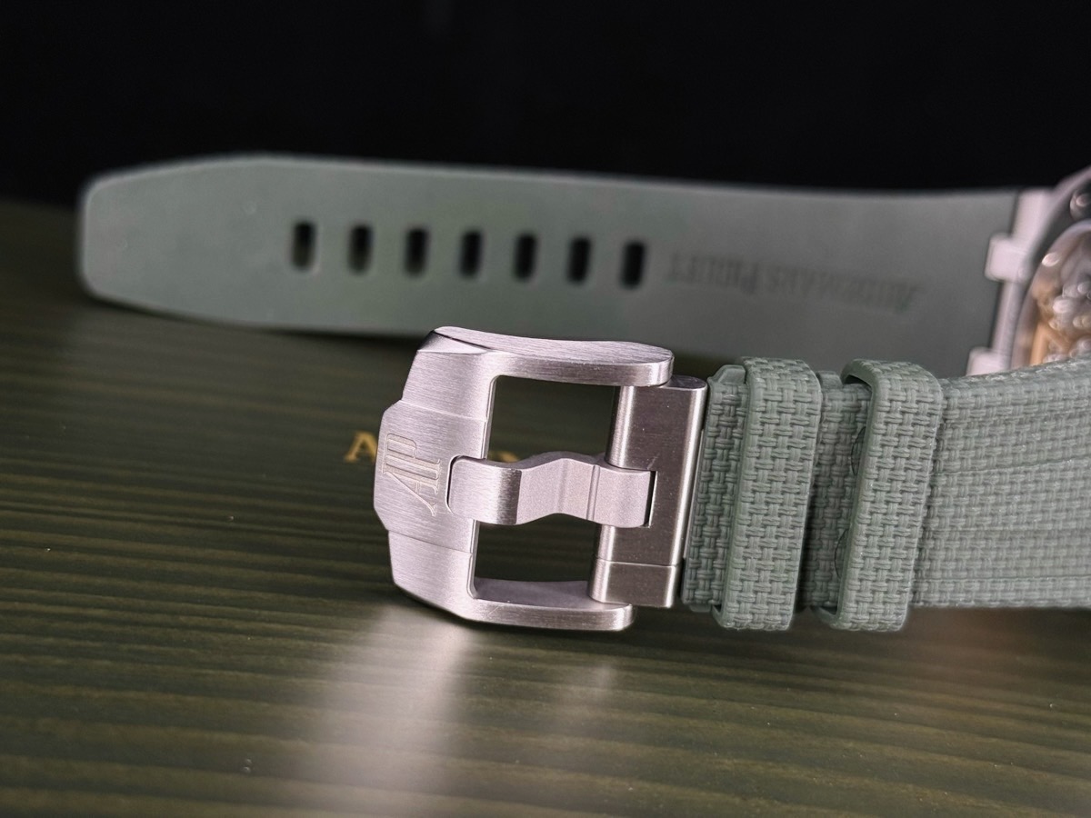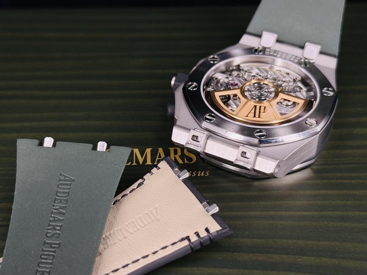 鈦金屬材質錶殼及傳統穿帶扣 / 黑色橡膠按鈕與旋入式錶冠 / 軍綠色錶面鐫刻「Mega Tapisserie」超大型格紋裝飾圖案,搭配銀色計時器、螢光塗層阿拉伯數字時標與皇家橡樹指針、軍綠色內錶圈 / 旋入式錶冠 / 原廠軍綠色易換式橡膠錶帶/ 藍寶石水晶玻璃鏡面及透明錶背