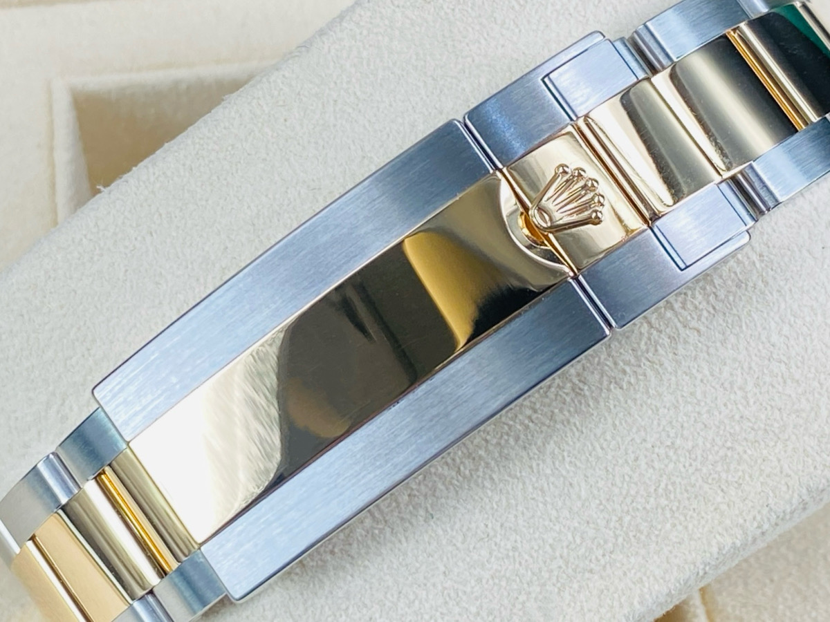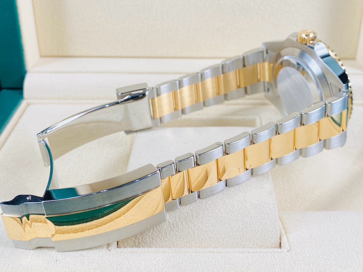 904L精鋼+18K黃金材質錶殼、錶帶、快調式摺疊扣 / 藍色放射紋面盤 / 夜光賓士指針、時標 / Cerachrom藍色陶瓷單向旋轉錶圈 / 旋入式錶冠 / 抗磨損藍寶石水晶玻璃 / 防偽內圈