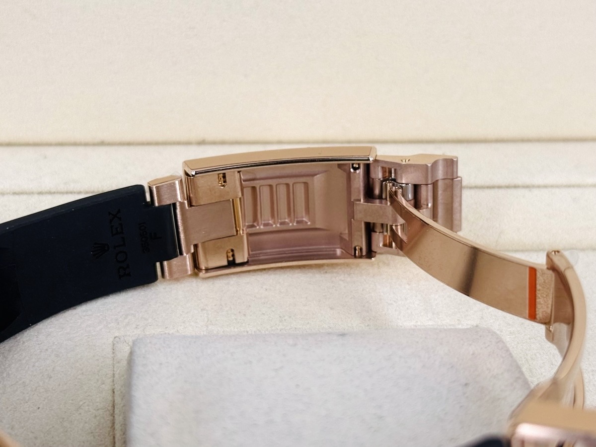 18K永恆玫瑰金材質錶殼、摺疊帶扣、旋入式錶冠、計時按把及旋入式底蓋 / 夜光指針及時標 / Cerachrom黑色陶瓷計視距儀刻度錶圈 / 勞力士新式Oysterflex錶帶黑色橡膠錶帶 / 藍寶石水晶玻璃鏡面 / 防偽內圈