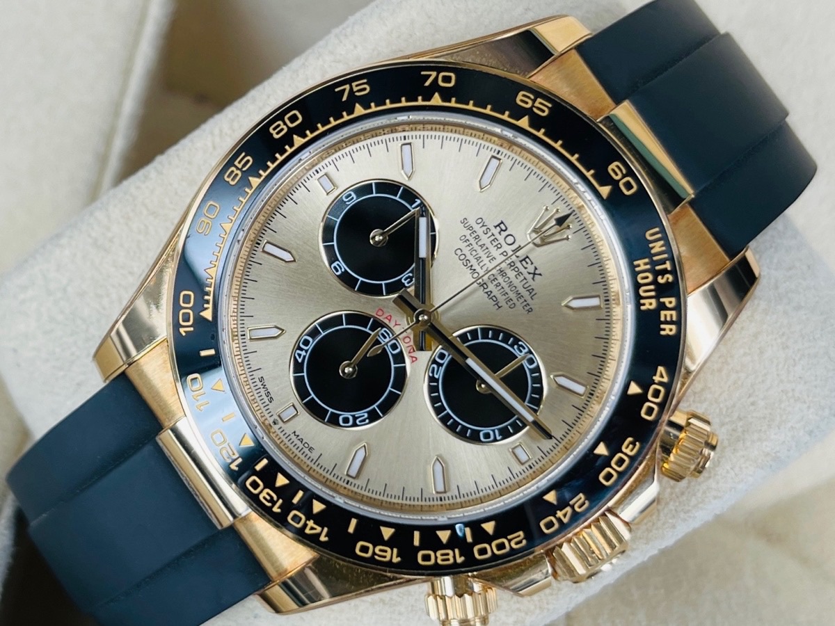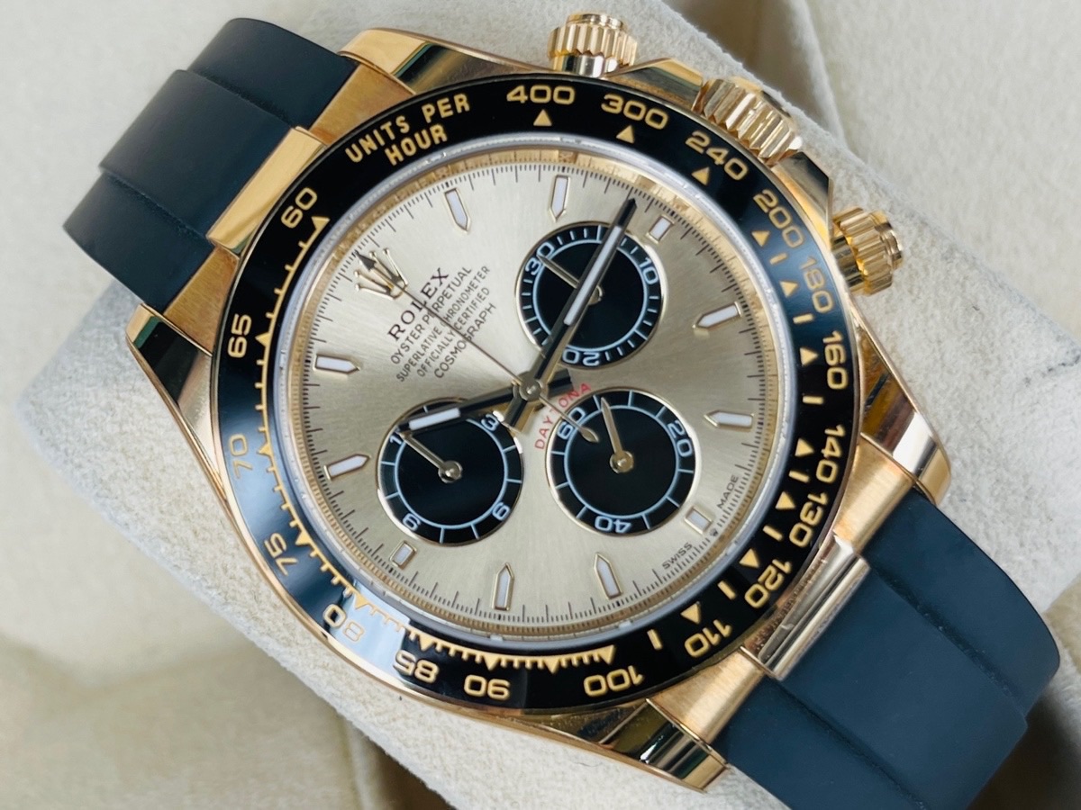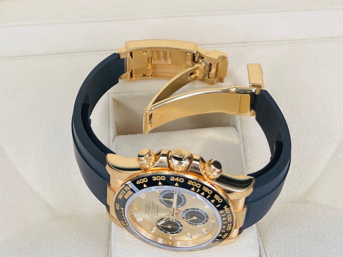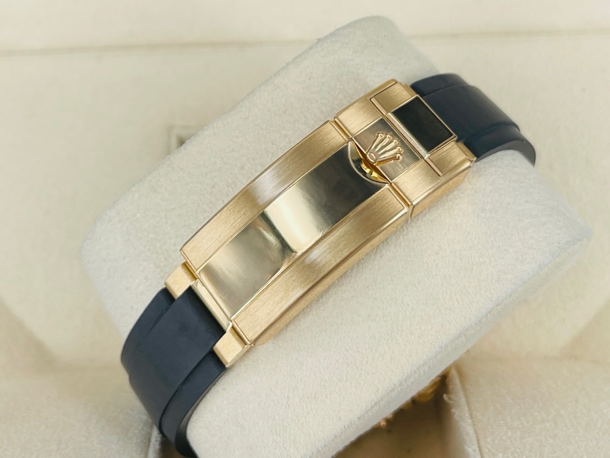 18ct黃金材質錶殼、摺疊帶扣、旋入式錶冠、計時按把及旋入式底蓋 / 夜光指針及時標 / 黑色Cerachrom陶質字圈連鑄模測速計 / OYSTERFLEX黑色橡膠錶帶 / 藍寶石水晶玻璃鏡面 / 防偽內圈