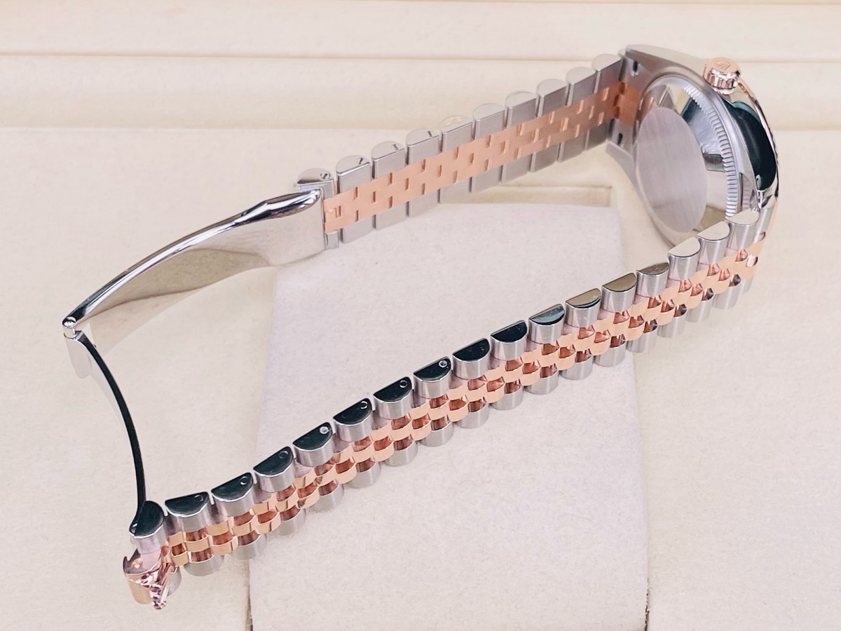 18K玫瑰金+904L不鏽鋼材質錶殼、錶帶、旋入式錶冠 / 玫瑰金指針 / 藍寶石水晶玻璃 / 防偽內圈