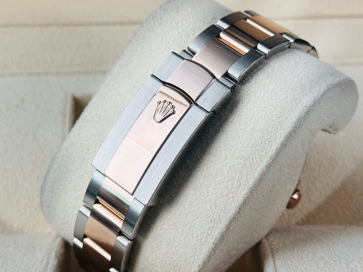 18K玫瑰金材質搭配904L不鏽鋼材質錶殼、五珠錶鏈帶及摺疊帶扣 / 原廠鑽石時標 / 藍寶石水晶玻璃鏡面
