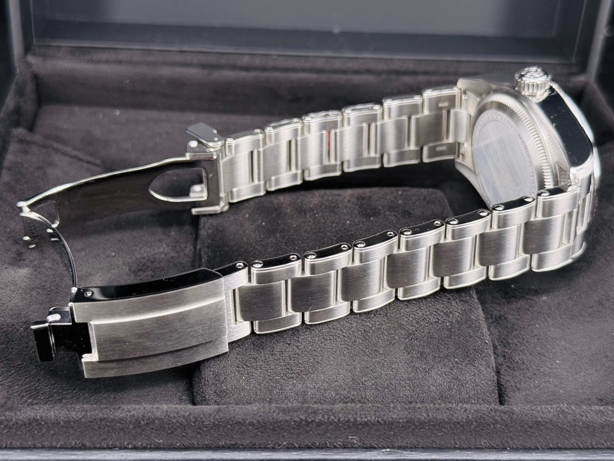 磨光及磨砂鋼錶殼 / 夜光指針及時標 / 磨砂鋼24小時刻度固定外圈 / 圓拱形藍水晶鏡面