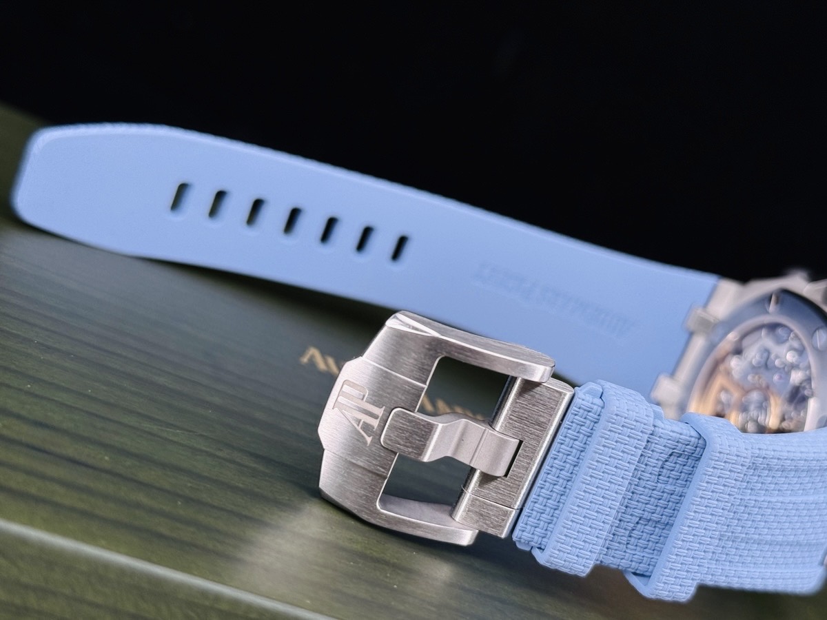 鋼材質錶殼及錶扣 / 黑色橡膠按鈕與旋入式錶冠 / 螢光塗層阿拉伯數字時標 / 皇家橡樹指針、黑色內錶圈 / 旋入式錶冠 / 原廠藍色橡膠錶帶飾以紡織裝飾圖案、附帶一條黑色小牛皮錶帶 / 藍寶石水晶玻璃鏡面 / 透明錶背