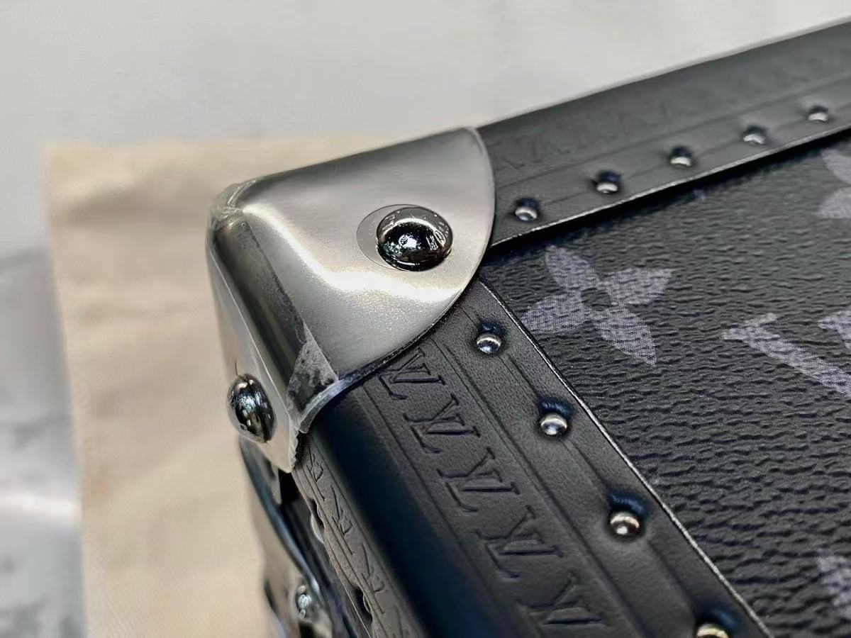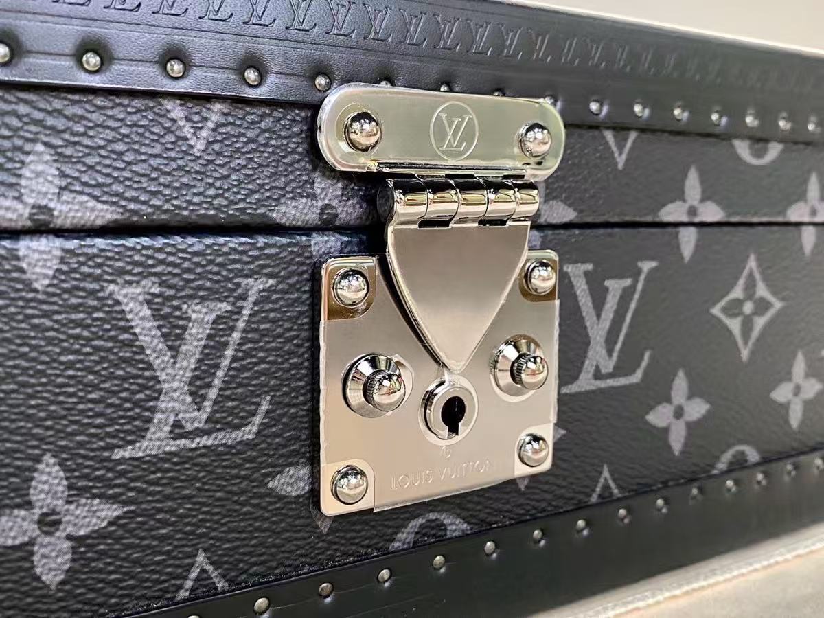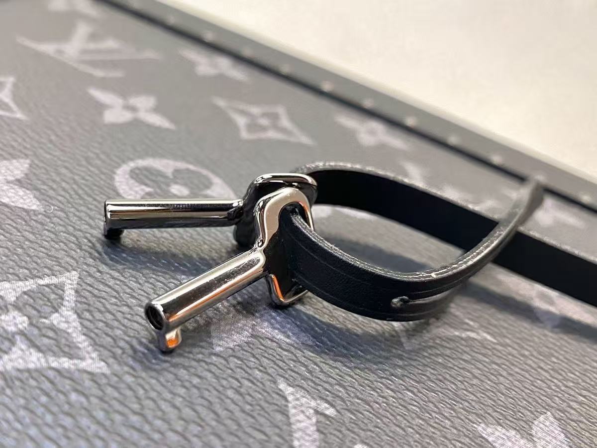 Monogram Eclipse塗層帆布 微纖維襯裡 / 釕金屬件 / S鎖扣,附鑰匙 / 可拆式腕錶軟墊 / 皮革鑲飾以鉚釘加固,金屬包角