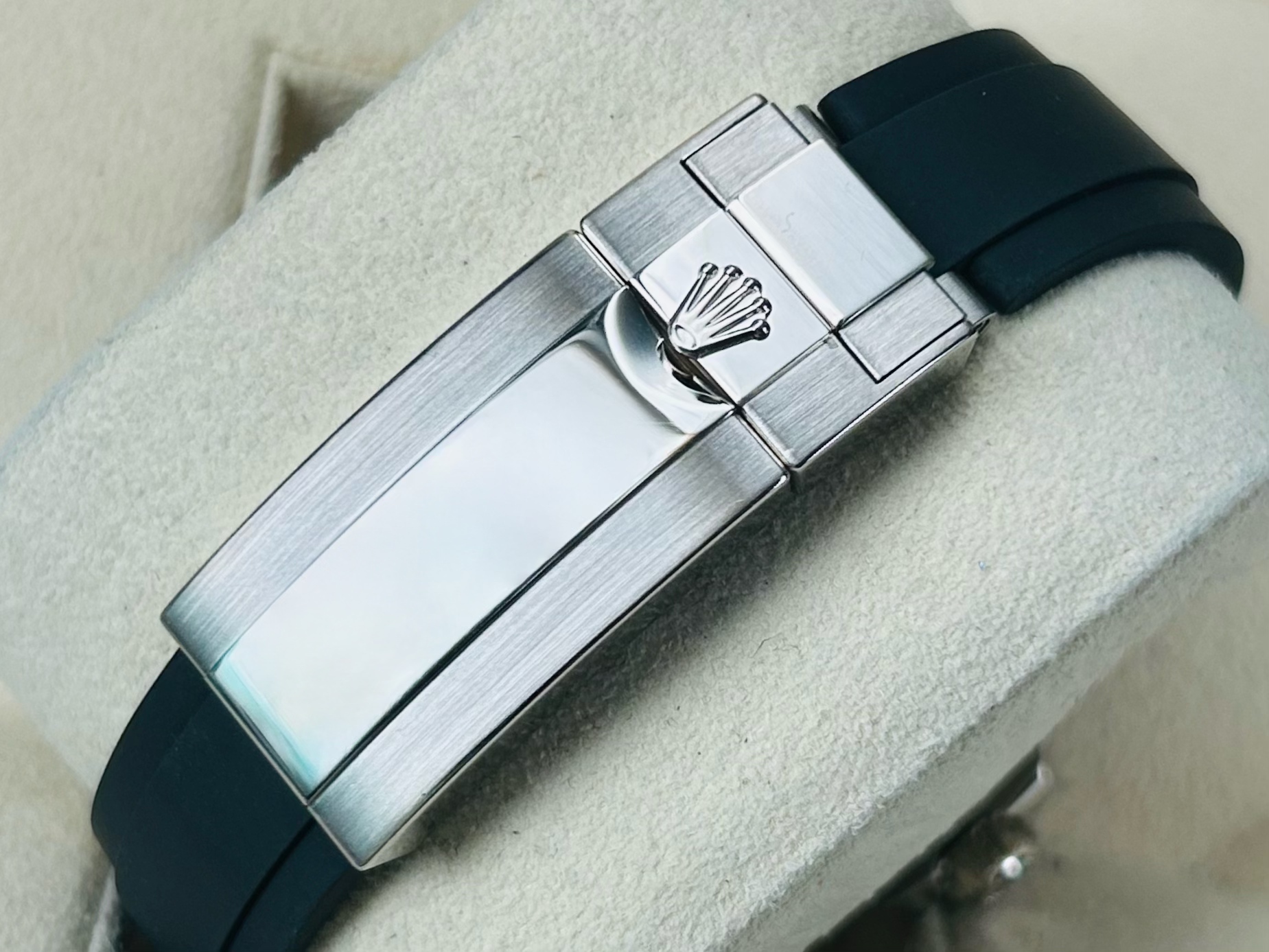 材質: 18k白金材質錶殼、錶帶、摺疊扣、旋入式錶冠 / Cerachrom黑色陶瓷刻度雙向旋轉錶框/ Oysterflex黑色橡膠錶帶 / 夜光時標及賓士指針 / 藍寶石水晶玻璃鏡面