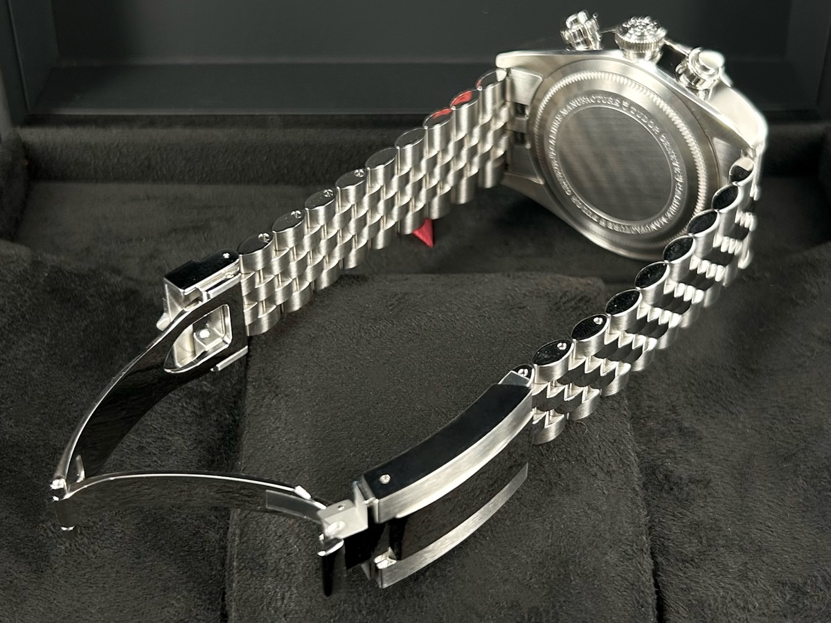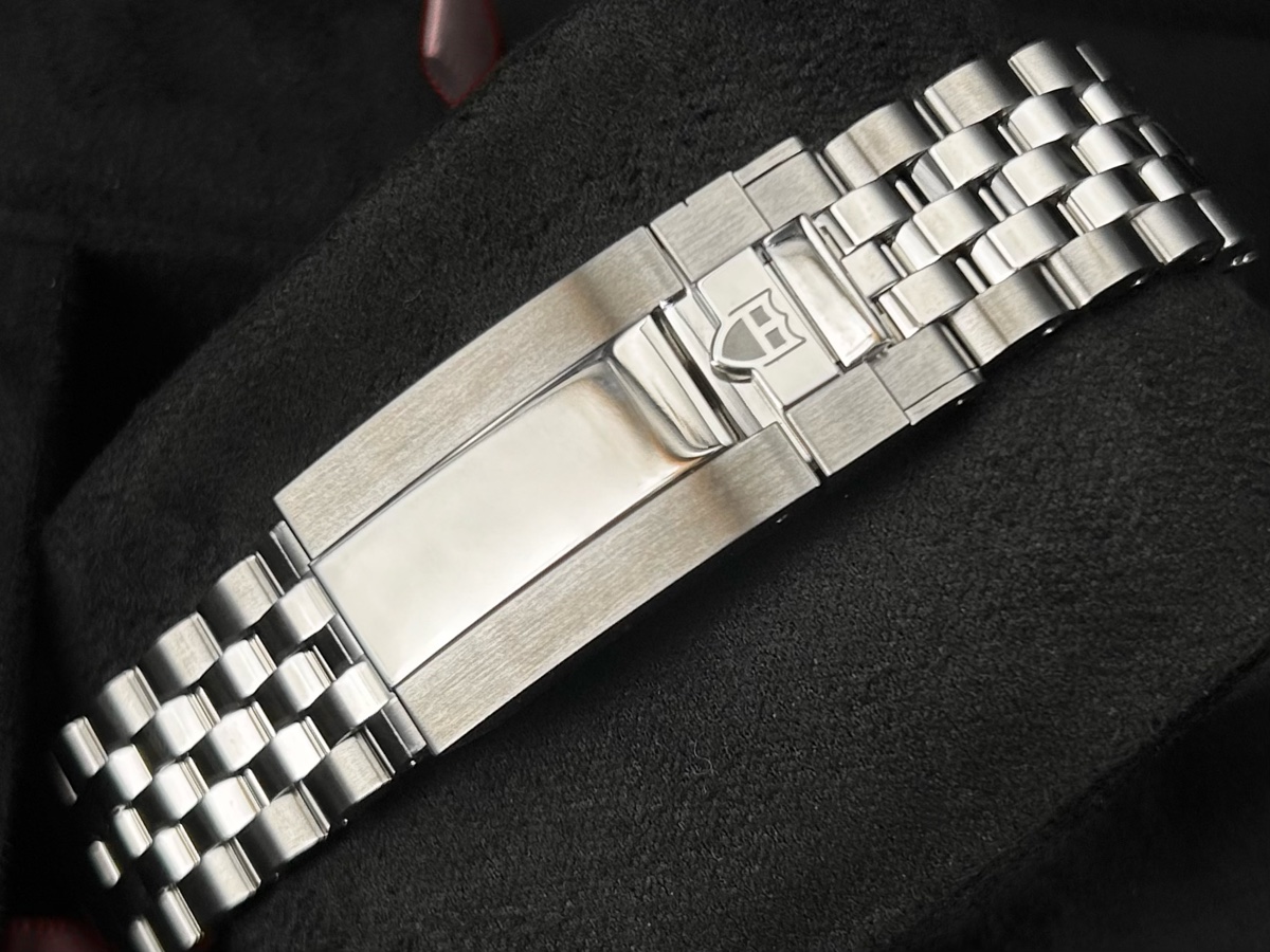 不鏽鋼錶殼、鍊帶、帶扣、旋入式錶冠 / 白色面盤、夜光雪花指針及時標 / 藍寶石水晶玻璃