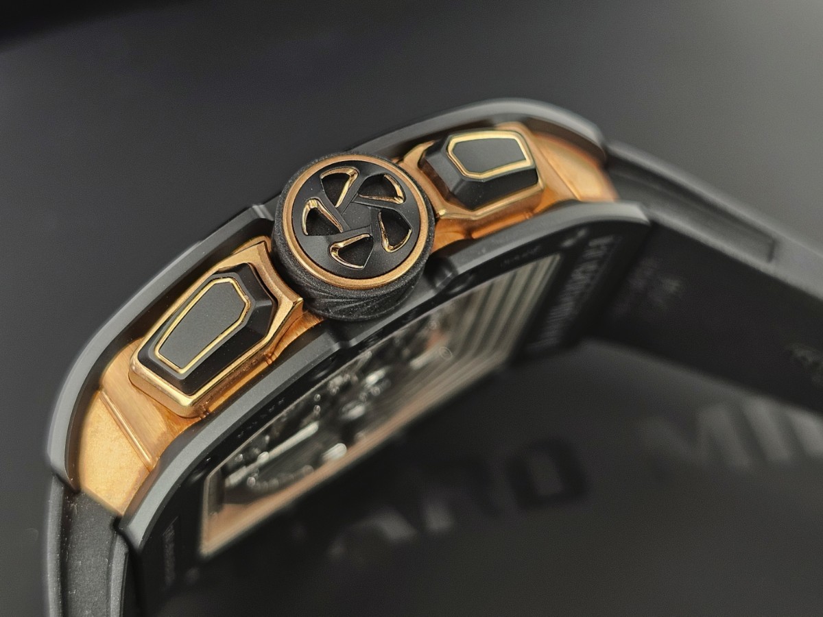 黑色陶瓷錶殼、玫瑰金屬摺疊扣、橡膠包覆錶冠 / 可變幾何擺陀的自動計時碼錶 / 3D立體鏤空面盤、夜光指針、立體阿拉伯數字時標 / 橡膠錶帶 / 藍寶石水晶玻璃 / 透明錶背