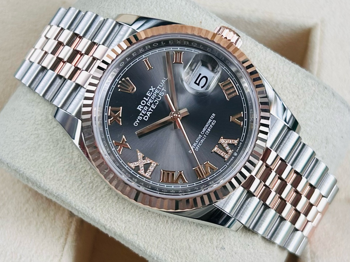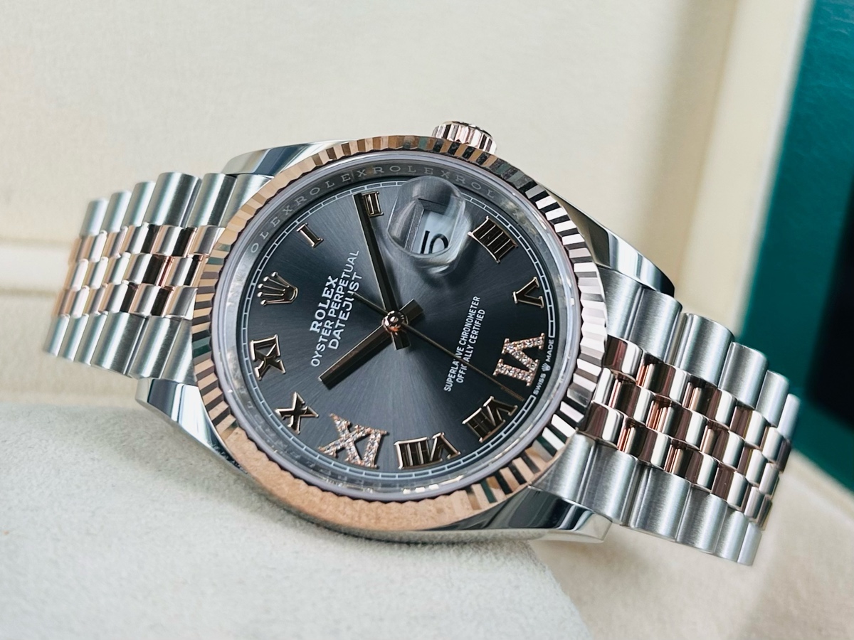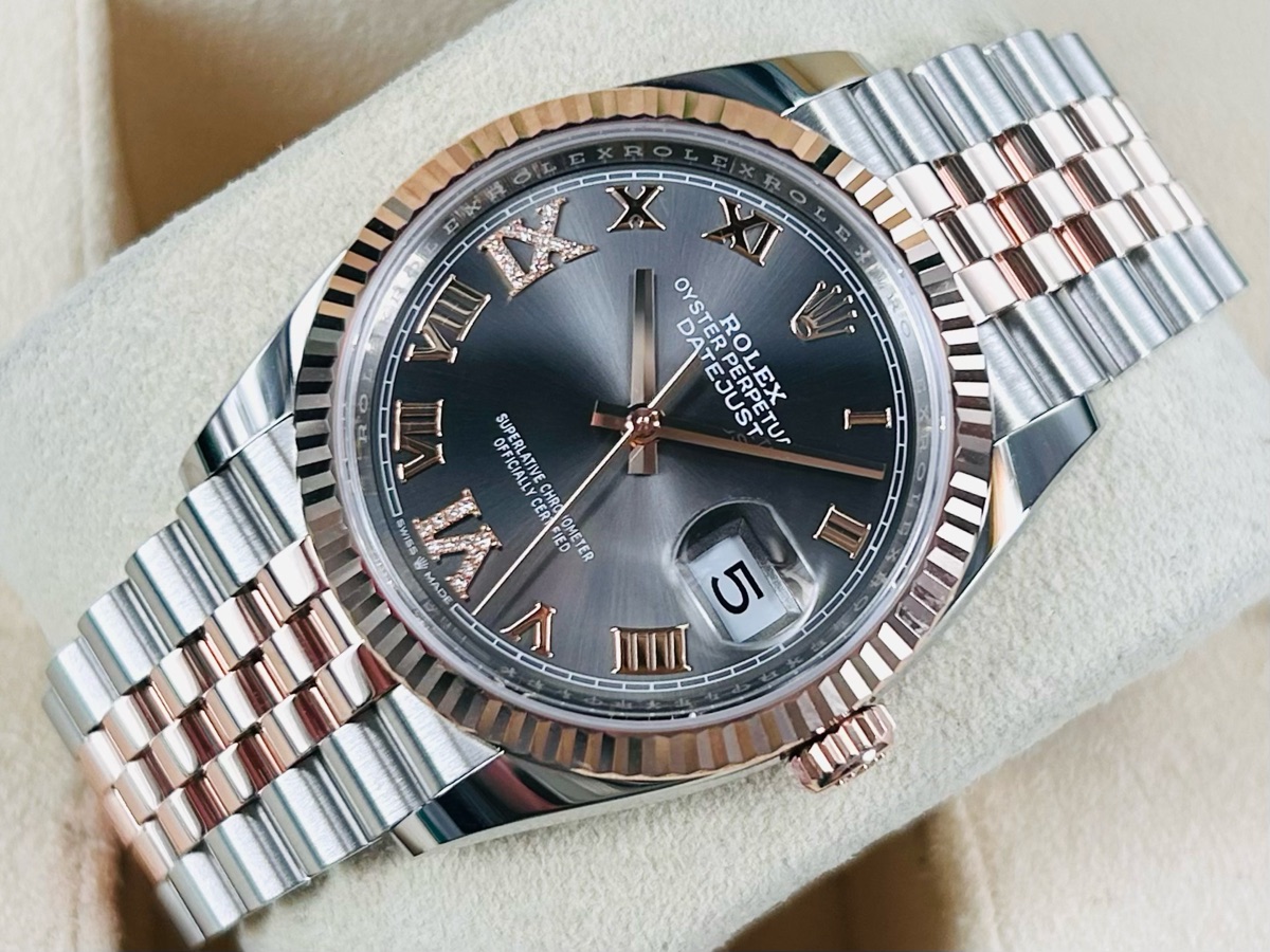 石板灰色面盤+鑲鑽羅馬數字VI及IX 最新款3235新機芯 紀念型五格鏈節錶帶款 永恒玫瑰金 半金