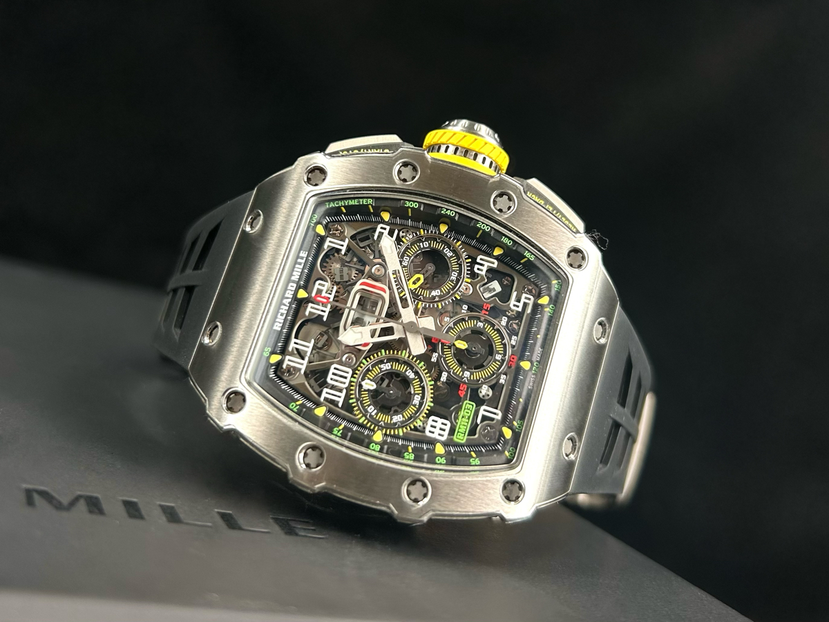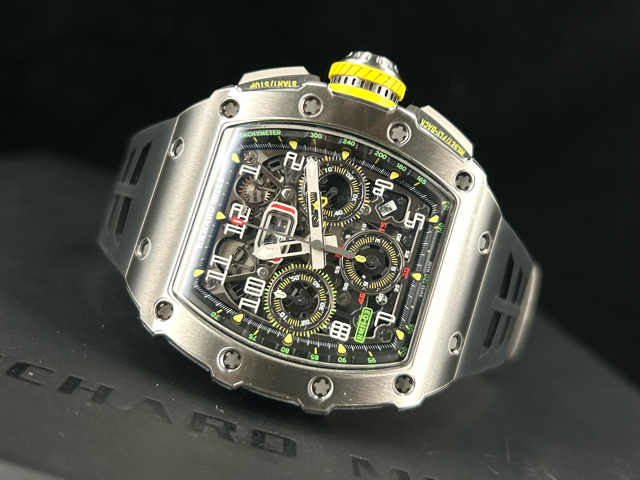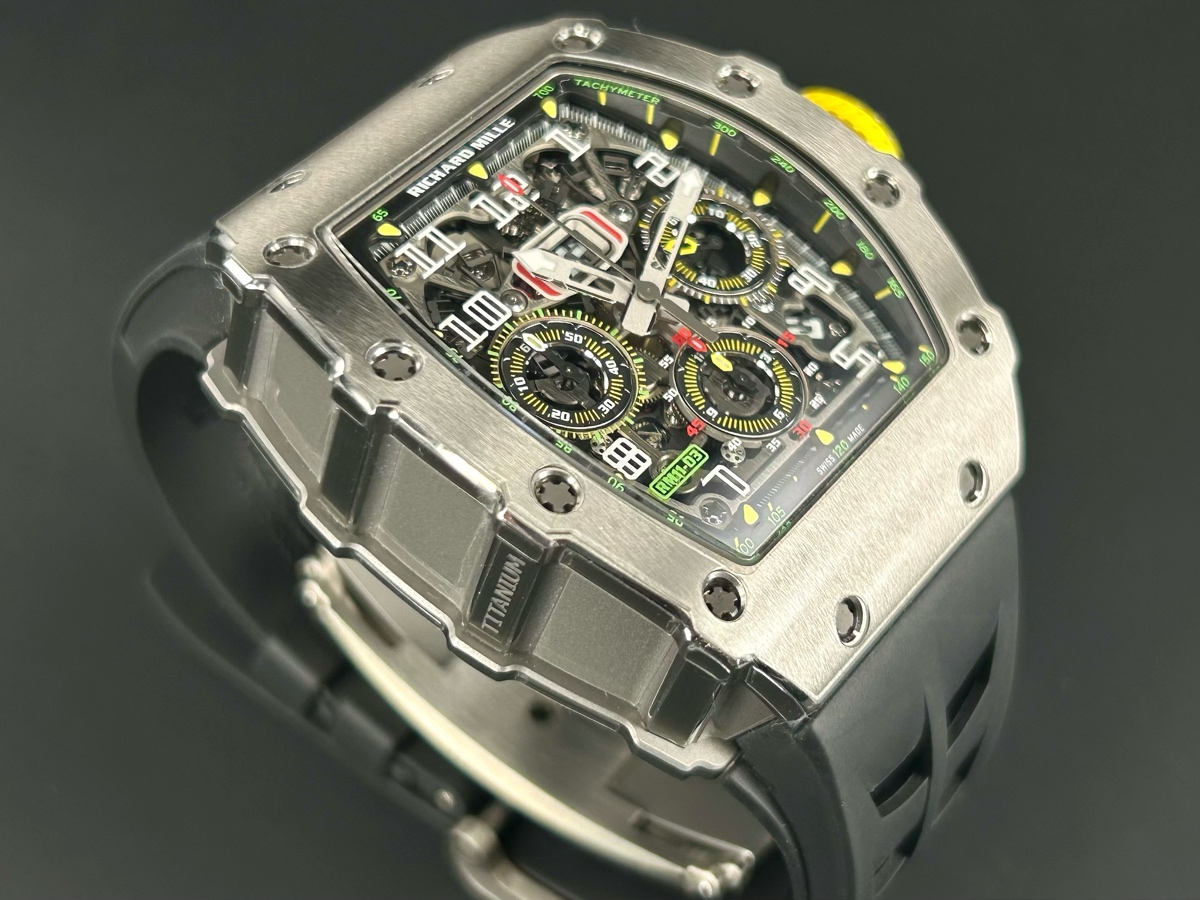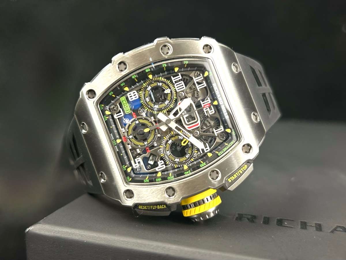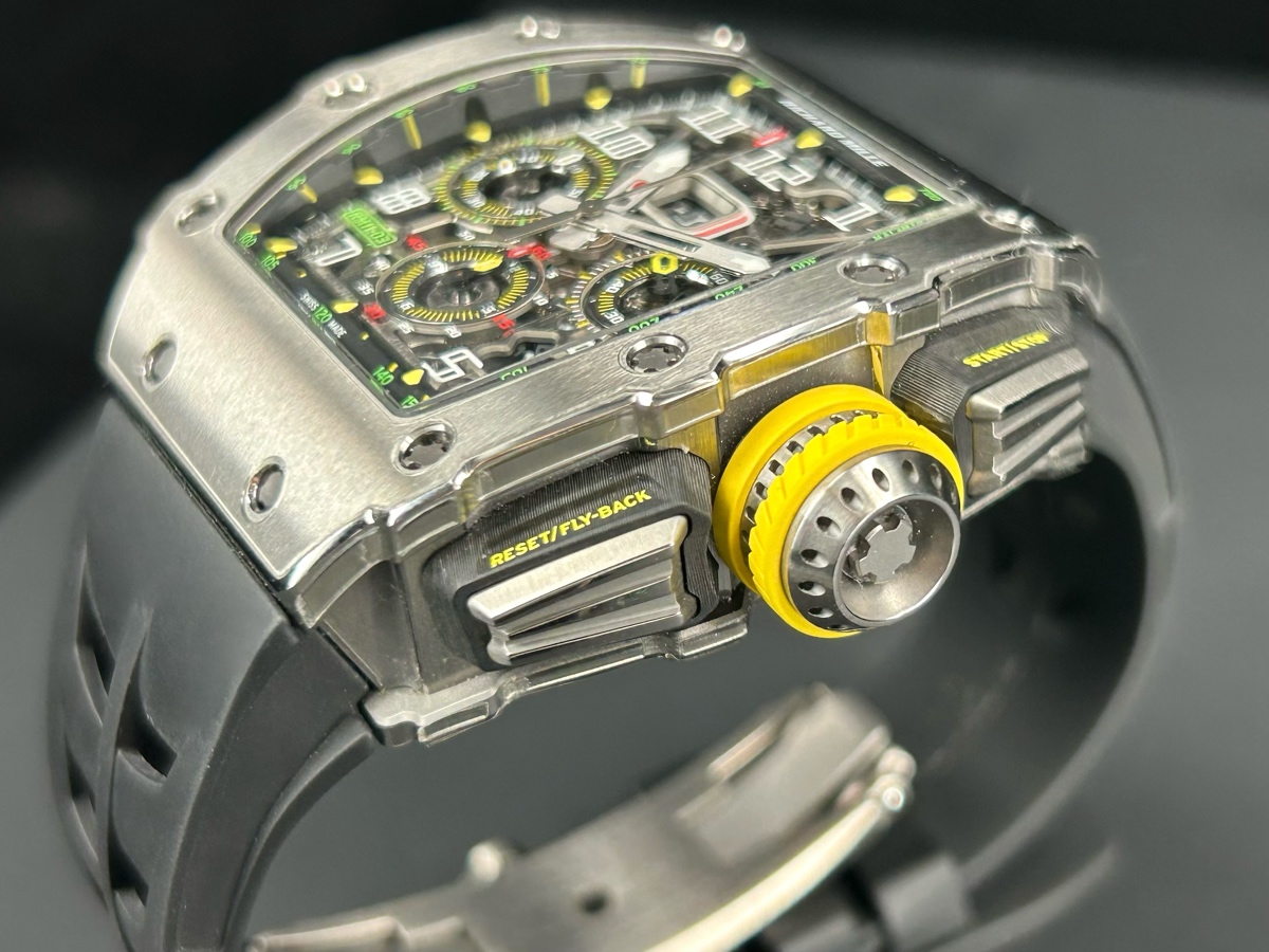 RICHARD MILLE 理查德•米勒RMAC3自動上鏈機械機芯 / 時、分、小秒針時間顯示 / 超大日期顯示 / 月份顯示 / 飛返計時碼表功能 / 可變幾何轉子 / 動能儲存55小時 / 防水:50m