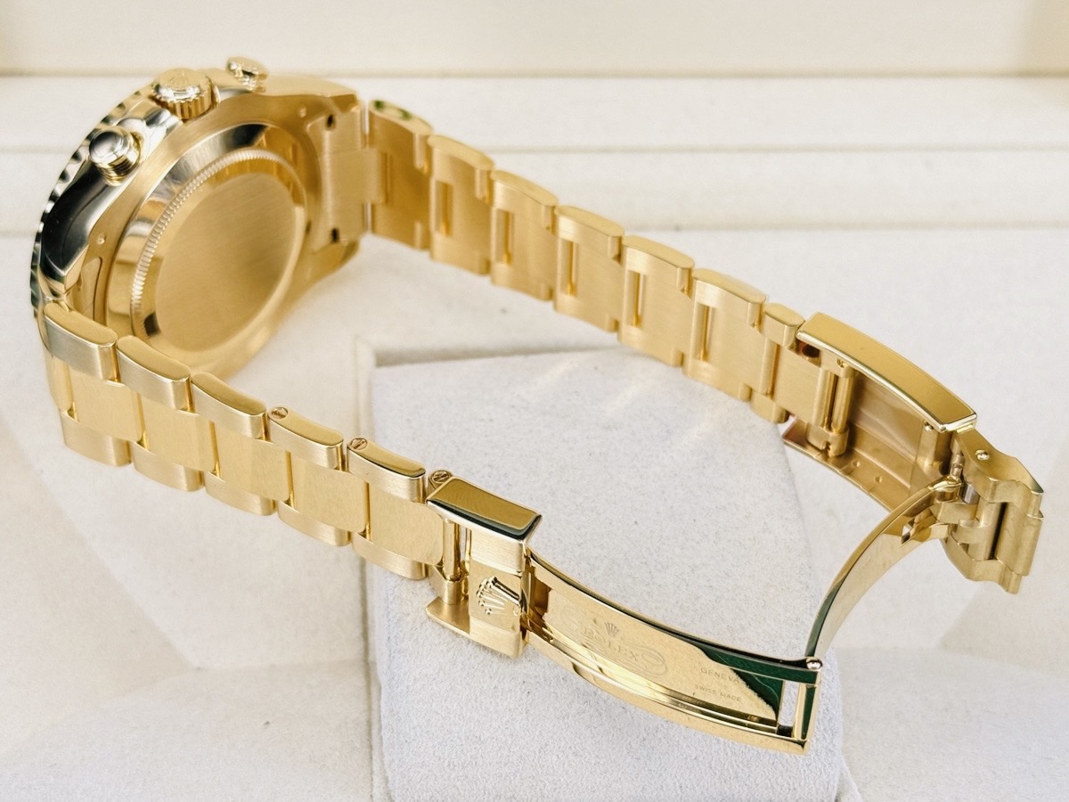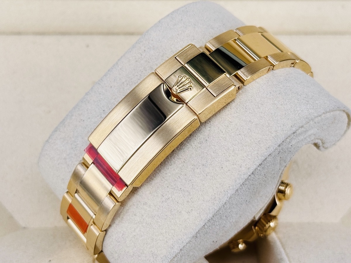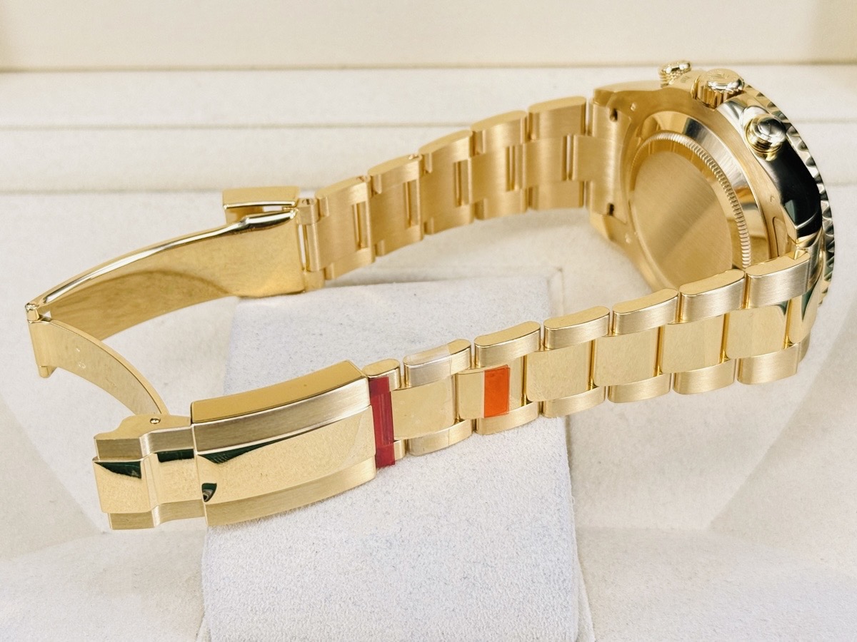 18K黃金材質錶殼、錶帶、摺疊扣 / 白色面盤、CHROMALIGHT(持久夜光黃K金指針、時標 / 黃K金材質旋轉錶圈,旋入式錶冠 / 抗磨損藍寶石水晶玻璃 / 防偽內圈