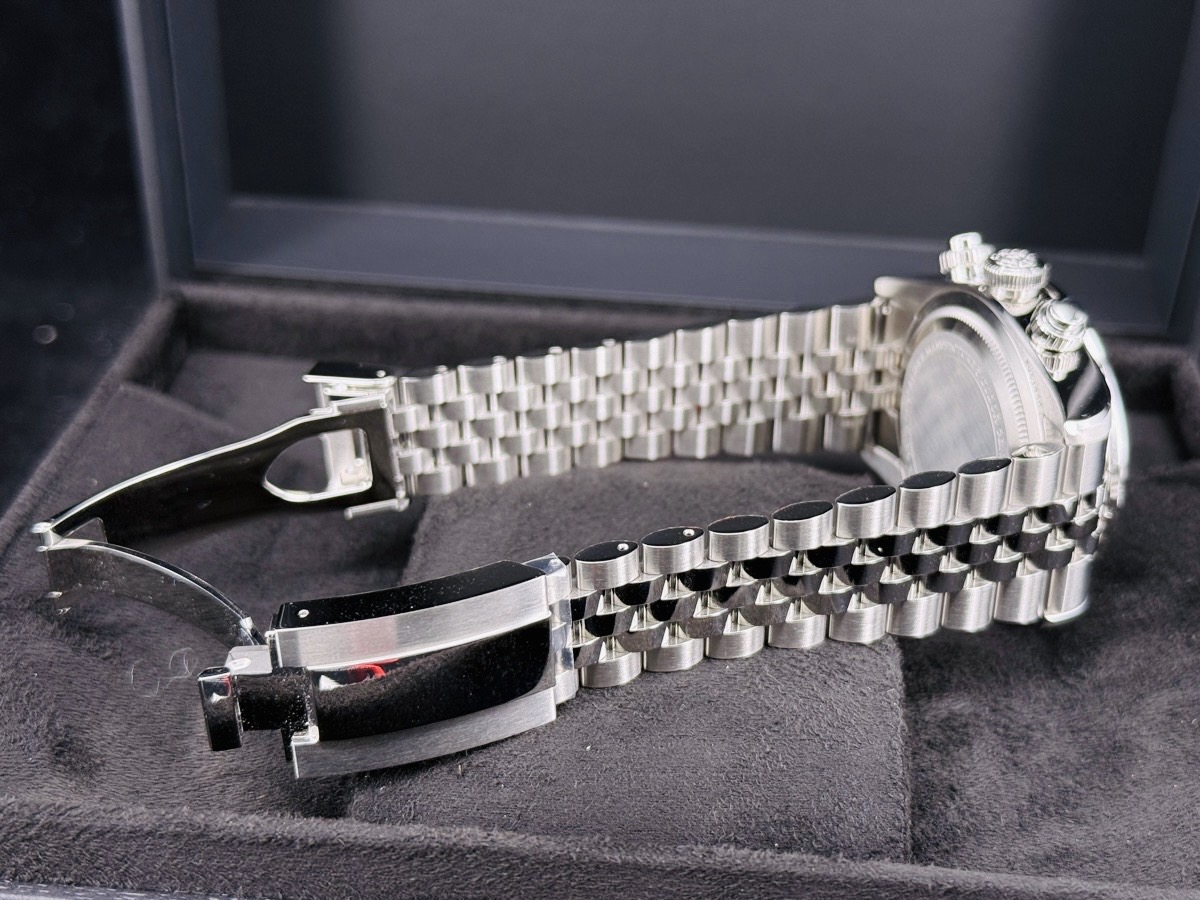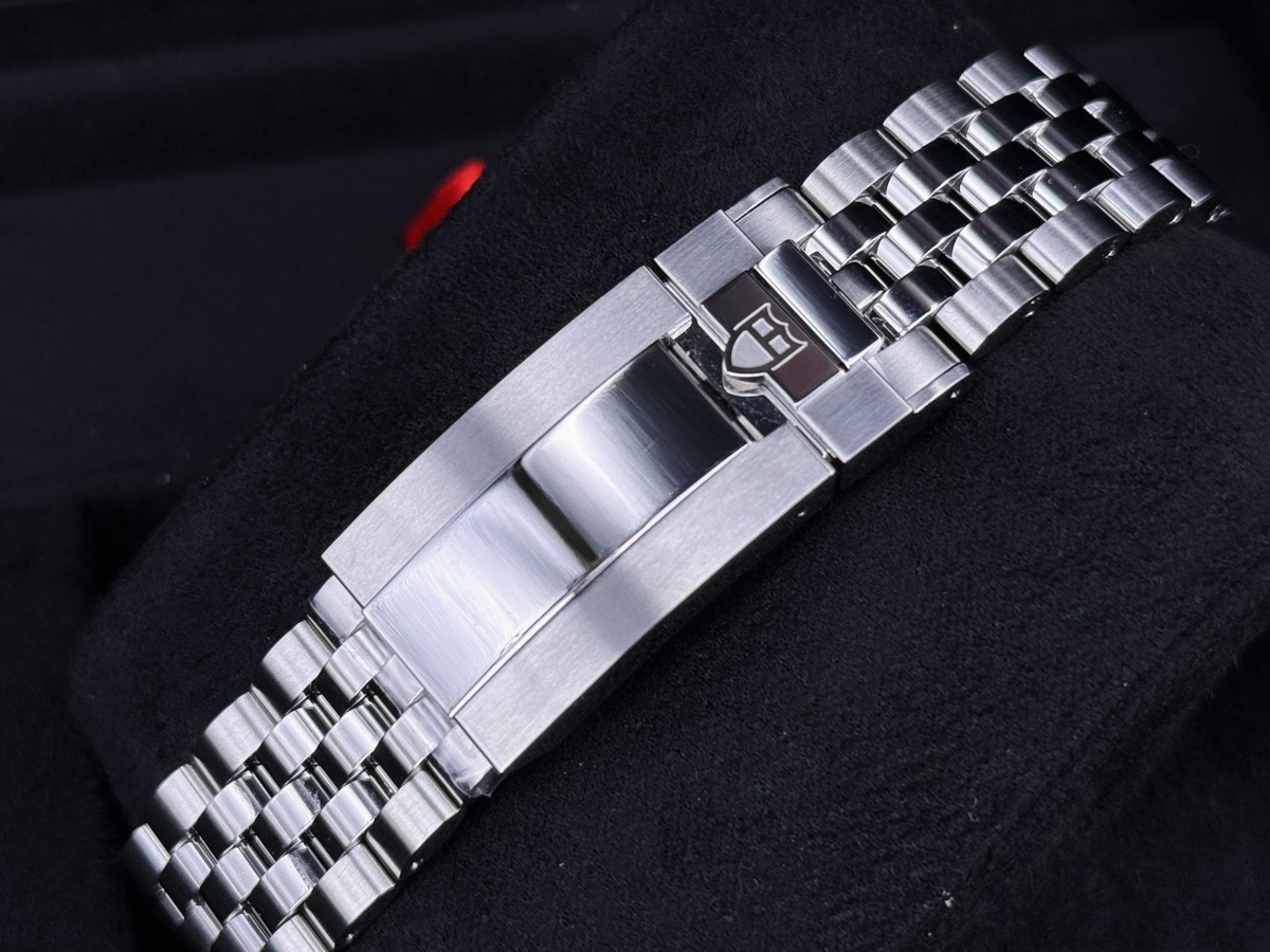 不鏽鋼錶殼、鏈帶摺疊扣、旋入式錶冠 / 夜光雪花指針及時標 / 藍寶石水晶玻