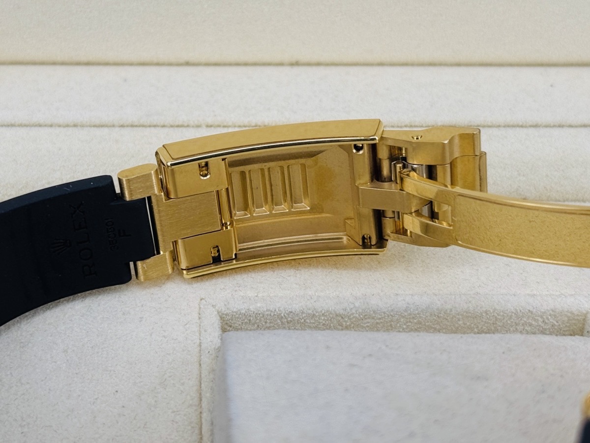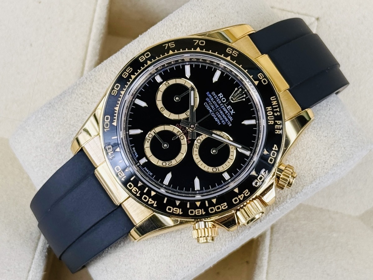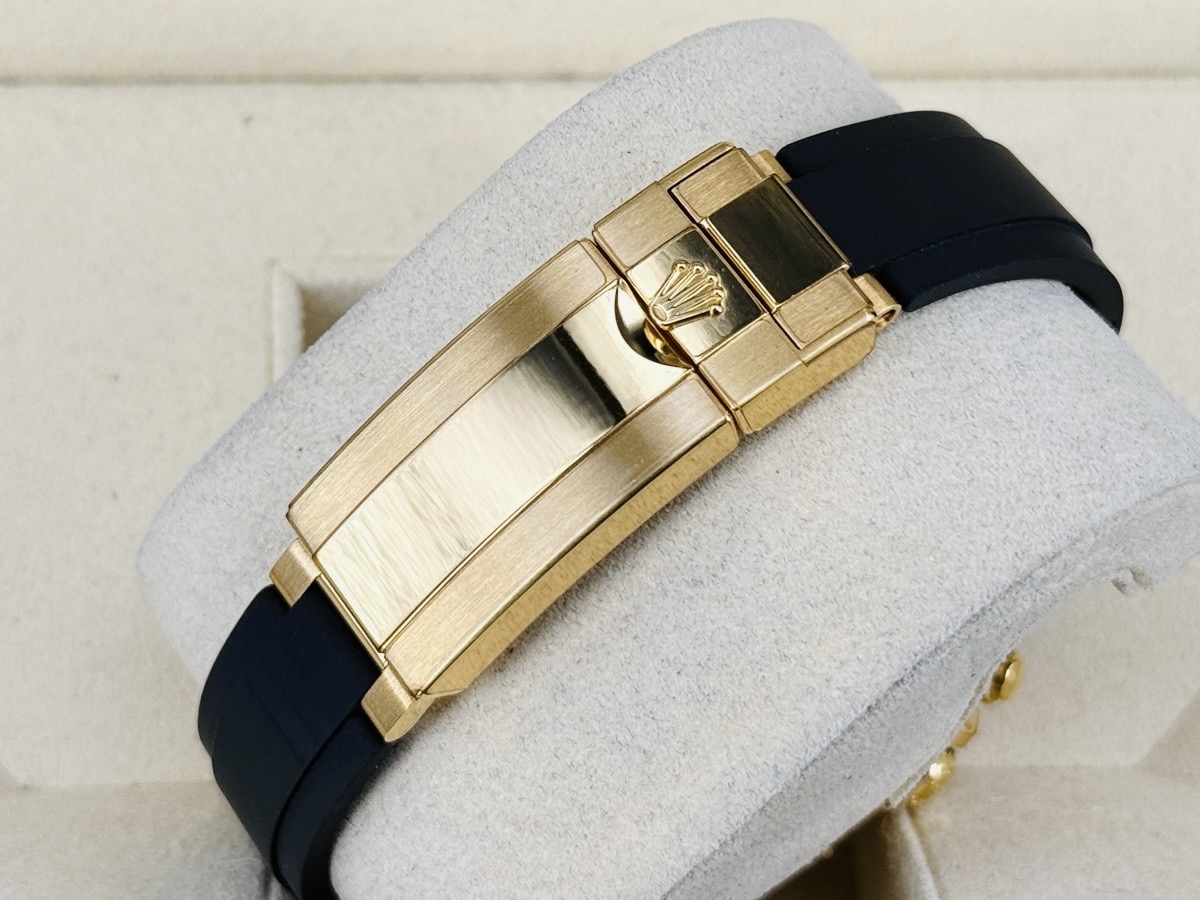 18ct黃金材質錶殼、摺疊帶扣、旋入式錶冠、計時按把及旋入式底蓋 / 夜光指針及時標 / 黑色Cerachrom陶質字圈連鑄模測速計 / OYSTERFLEX黑色橡膠錶帶 / 藍寶石水晶玻璃鏡面 / 防偽內圈