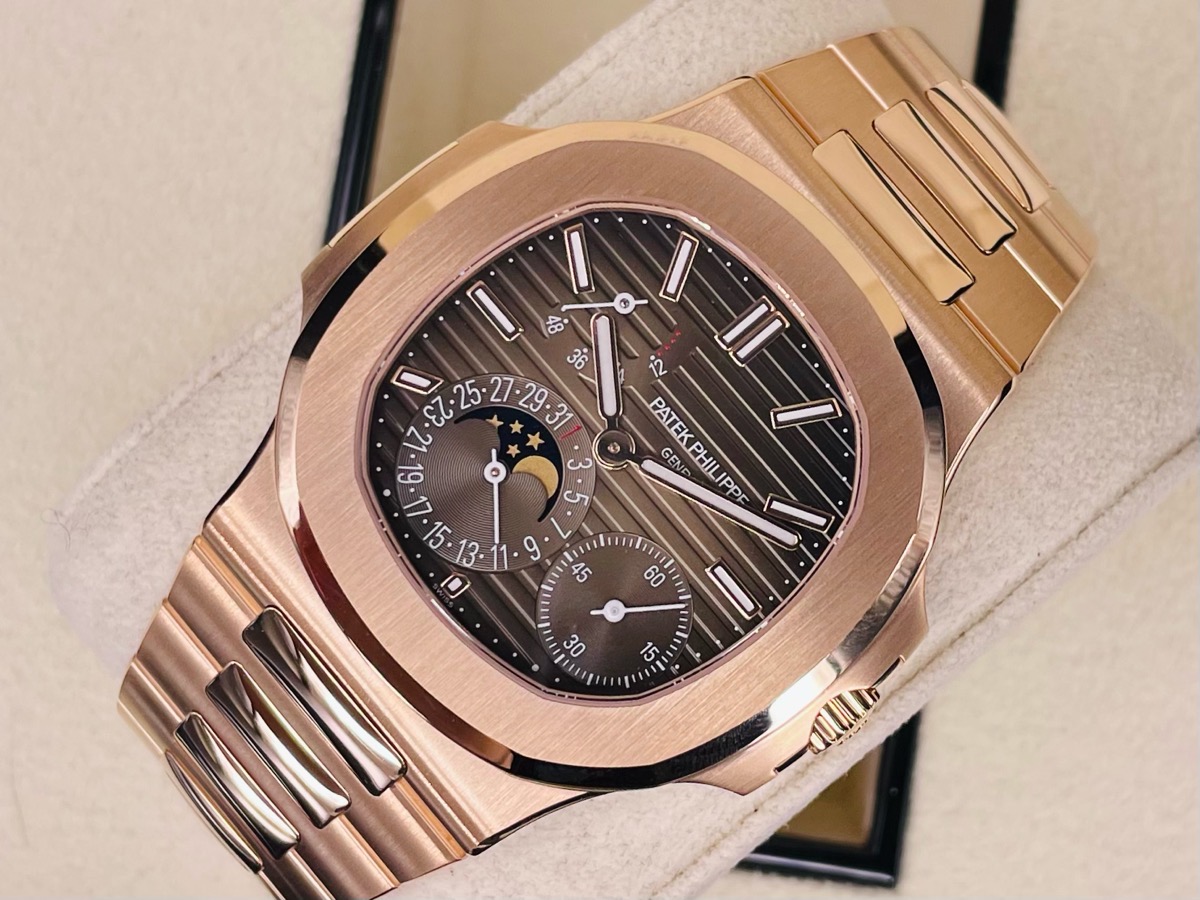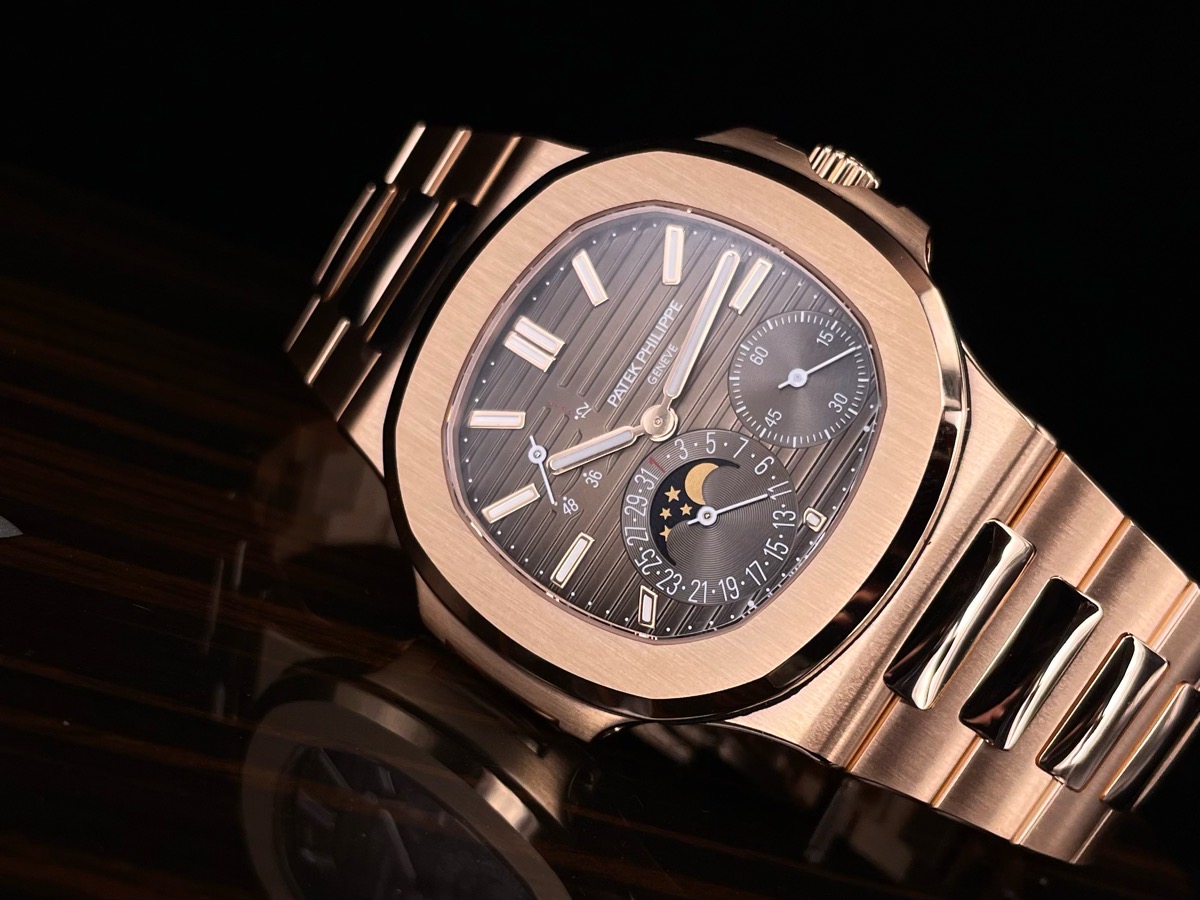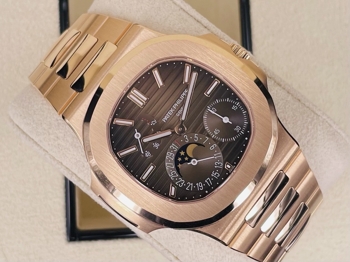 Patek philippe 百達翡麗 PP錶 Nautilus 5712/1R-001 棕色日輝紋錶盤 邊緣呈黑色漸變效果 水平橫紋浮雕圖案 覆熒光塗層的金質立體時標