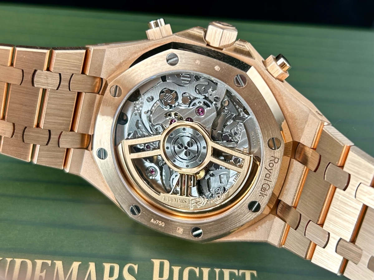 皇家橡樹獨特八角形螺絲外露設計錶圈 / 18K玫瑰金材質錶殼及折疊帶扣、計時按把、旋入式錶冠 / 藍寶石水晶玻璃鏡面 / 透明錶背