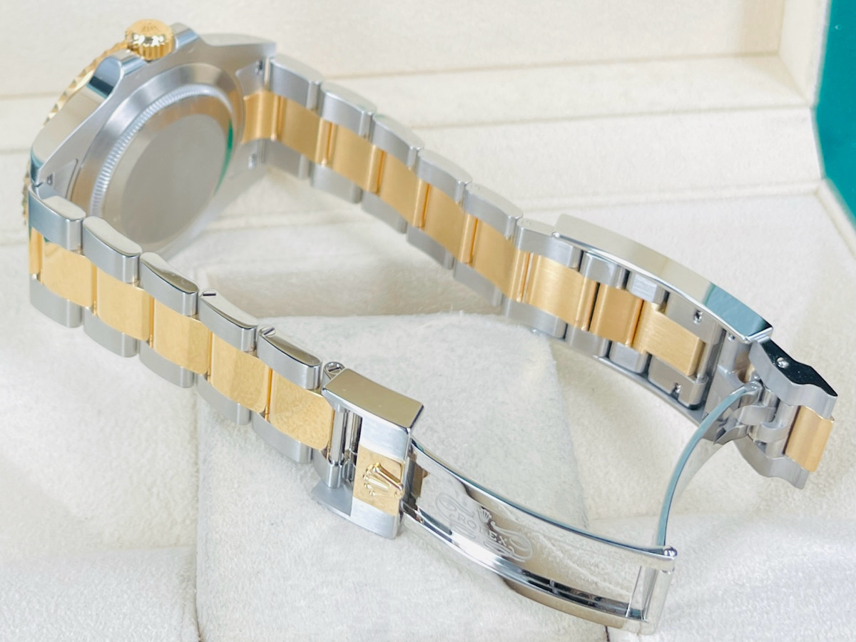 904L精鋼+18K黃金材質錶殼、錶帶、快調式摺疊扣 / 藍色放射紋面盤 / 夜光賓士指針、時標 / Cerachrom藍色陶瓷單向旋轉錶圈 / 旋入式錶冠 / 抗磨損藍寶石水晶玻璃 / 防偽內圈