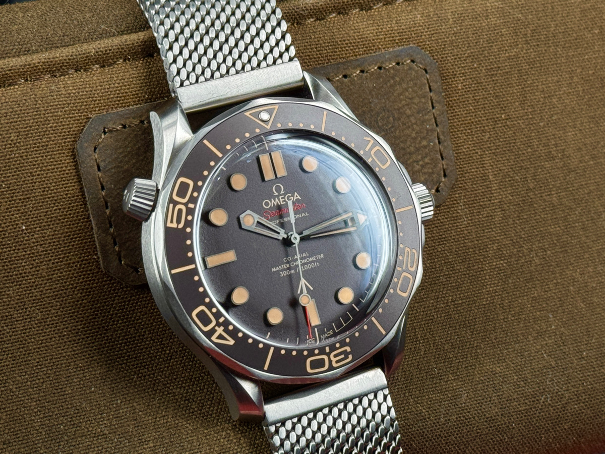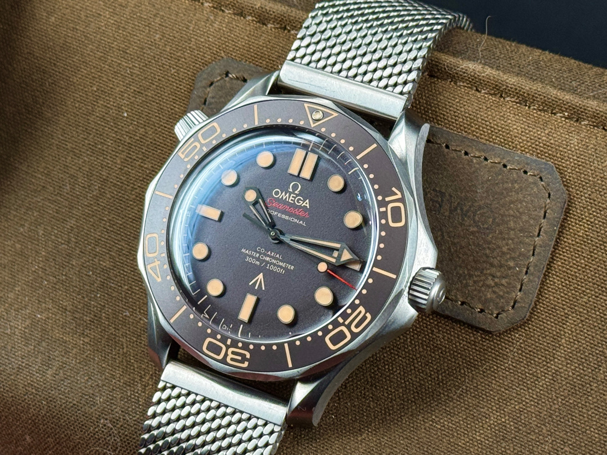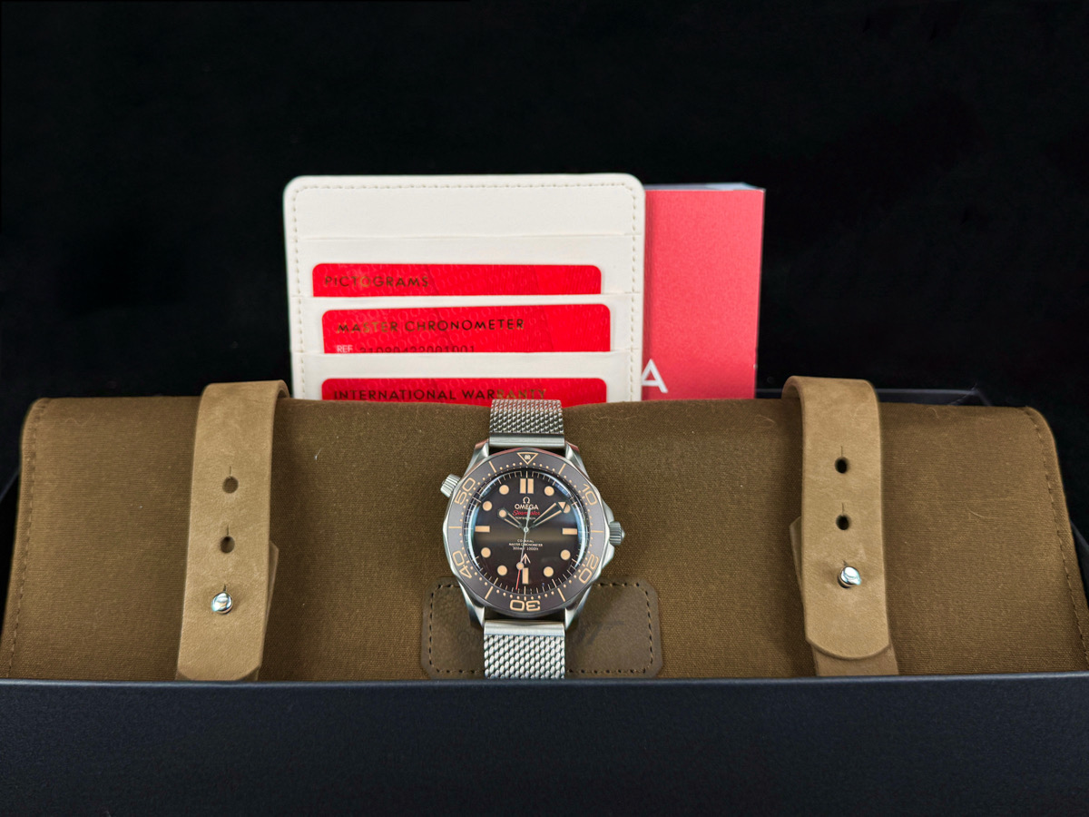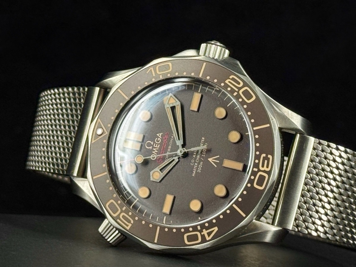 OMEGA 歐米茄 Sesmaster 海馬系列 007限定款 210.90.42.20.01.001 007 詹姆斯龐德在電影《007:生死交戰》中所佩戴的同款腕錶 鈦金屬材質 復古風格 米蘭錶帶 2023年保卡 自動上鍊 同軸擒縱