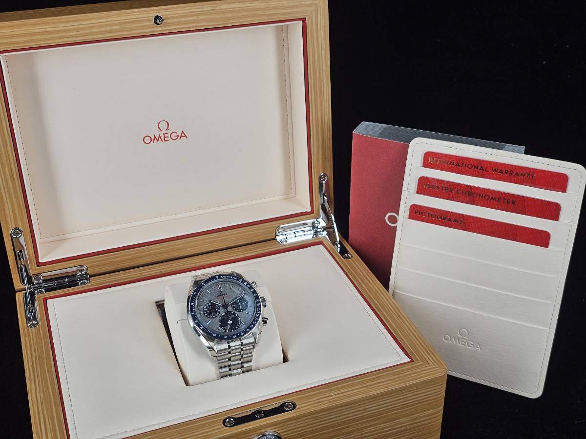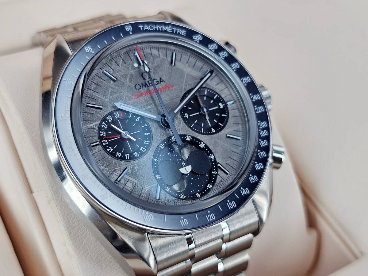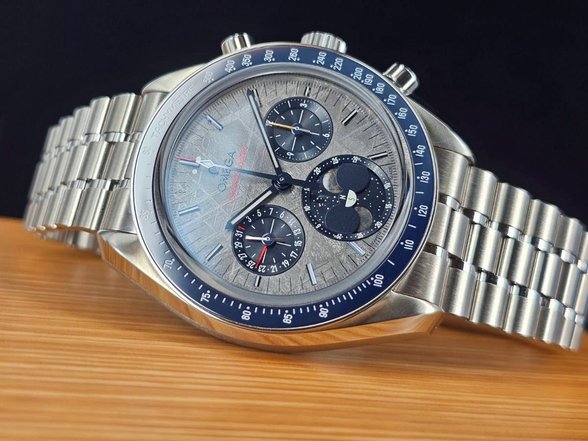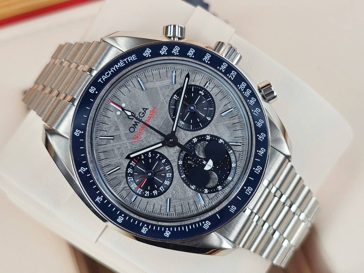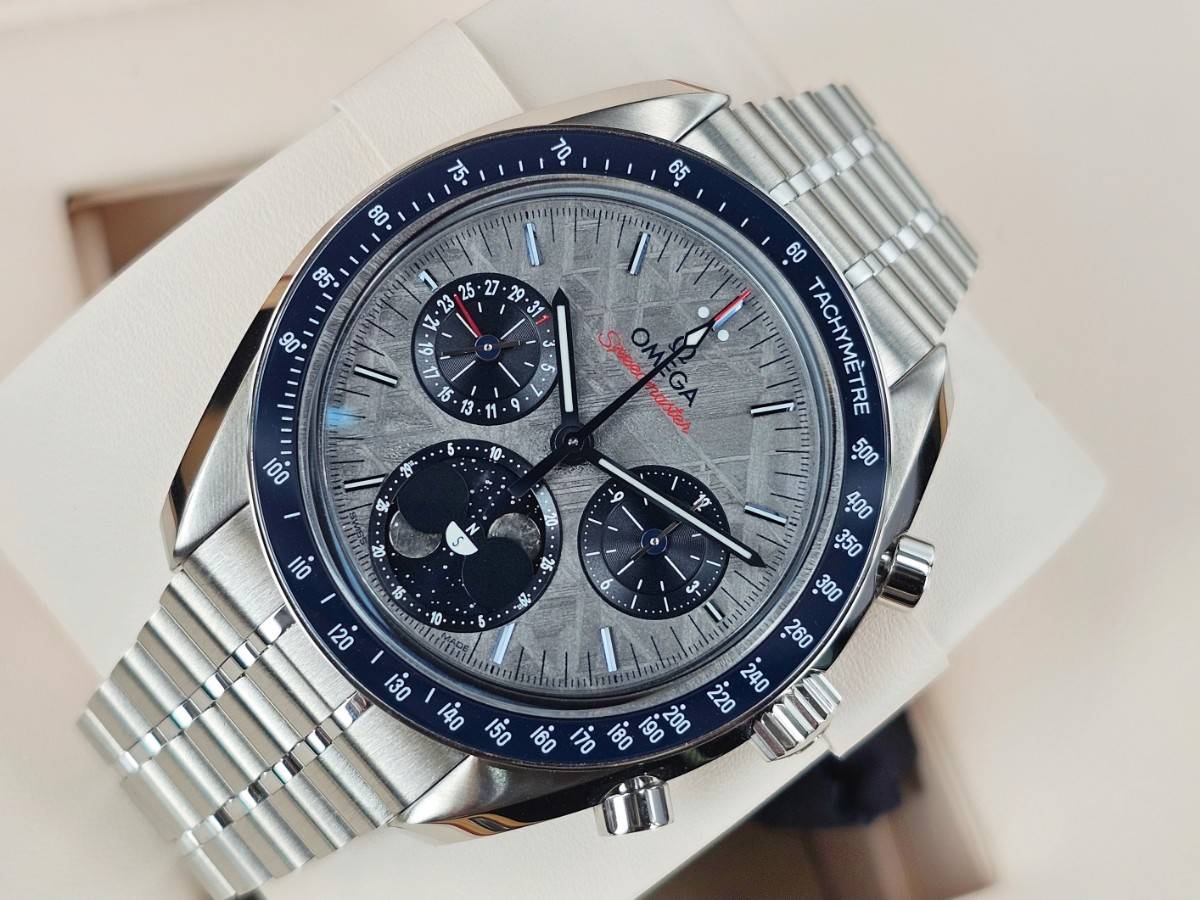 OMEGA 歐米茄 Speedmaster  隕石腕錶 超霸系列 月相腕錶 304.30.43.52.06.001 隕石面盤 測速刻度的藍色陶瓷錶圈 計時碼表 月相盈虧  陶瓷錶圈 2025年保卡