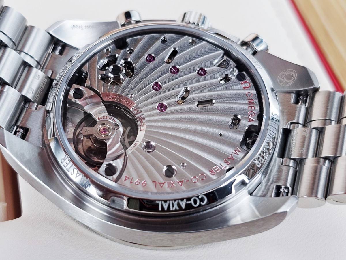 功能: Cal. 9914同軸擒縱裝置自動上鏈機芯 / 時、分、小秒針 / 60秒、60分鐘、12小時計時碼表 / 日期盤、月向盈虧顯示 / 動能儲存60小時 / 防水:10 巴 (100 米 / 330 呎)