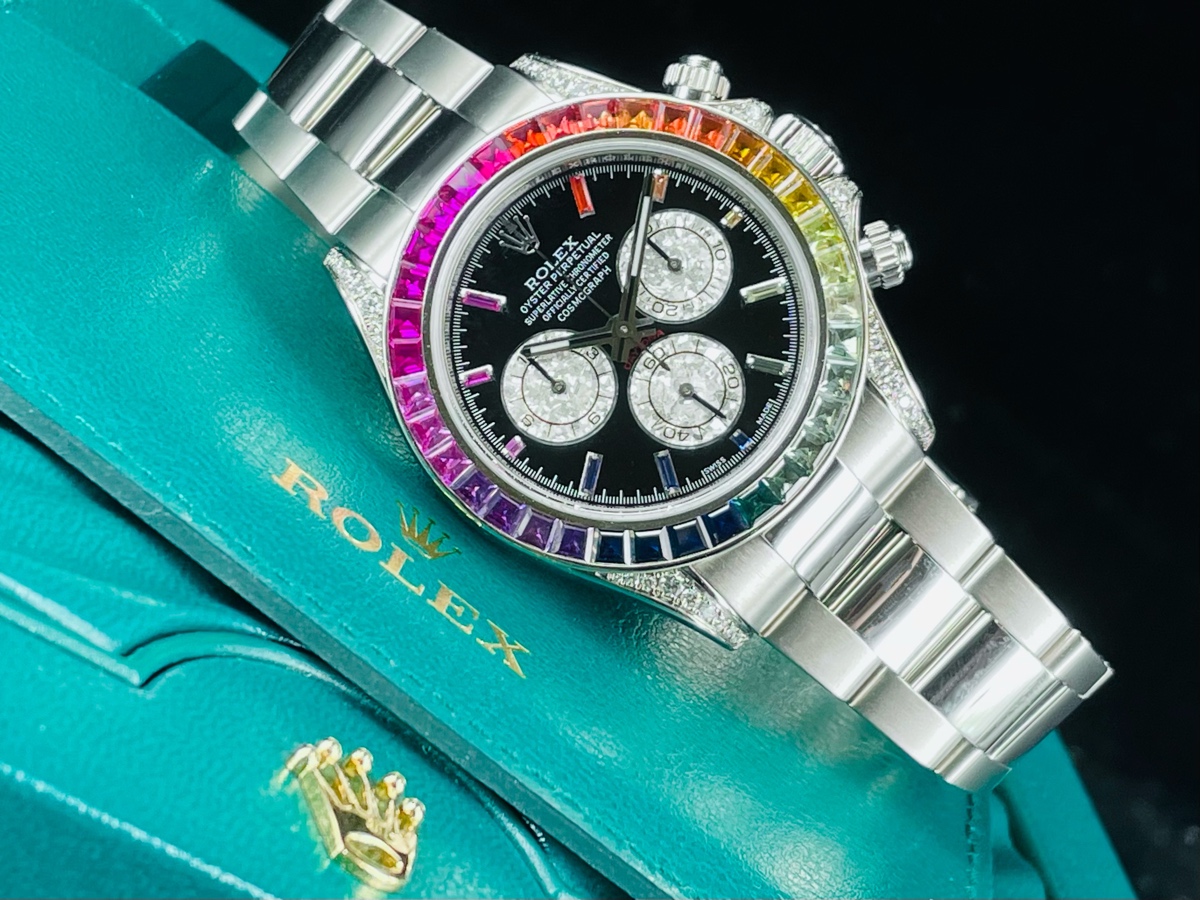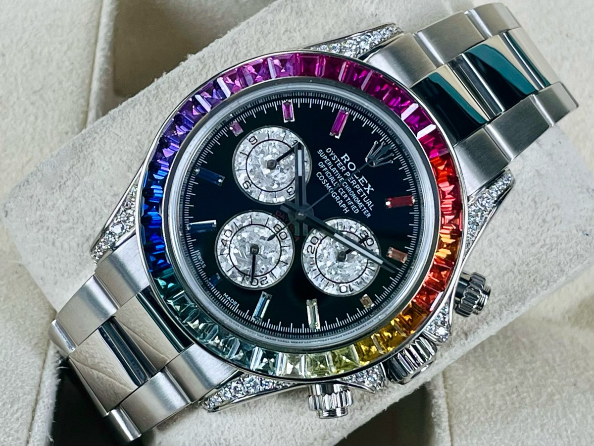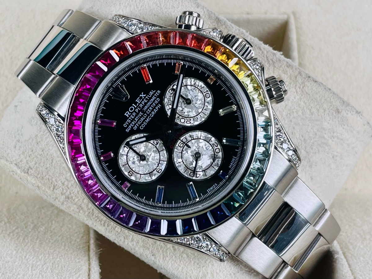 錶圈精鑲上紅橙黃綠青藍紫共七種顏色 36顆的彩鑽
