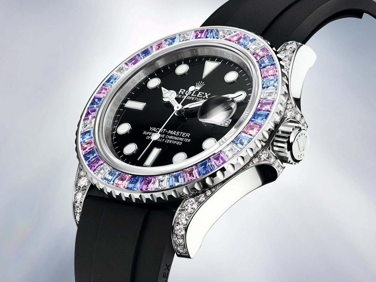 勞力士2022年全新發表的Yacht-Master 40 Ref.126679 SABR腕錶,擁有讓人一眼即能辨識身價的最高質感。腕錶首次以18ct白色黃金鑄造,雙向旋轉外圈上逐一鑲嵌排列著梯形粉紅色、淺藍色藍寶石、鑽石、紫色與深藍色藍寶石,耀眼卻和諧地散發著奪目的華麗光芒;12點鐘位置鑲嵌一顆三角形鑽石,錶耳與錶冠護肩也鑲嵌有46顆鑽石,更是讓人迷醉。每一顆都經過勞力士寶石鑑定部門的嚴密檢驗,以符合品牌對寶石品質及可靠性的嚴苛要求。由於這些七彩寶石呈現繽紛多姿的天然色調,每顆均以手工精挑細選