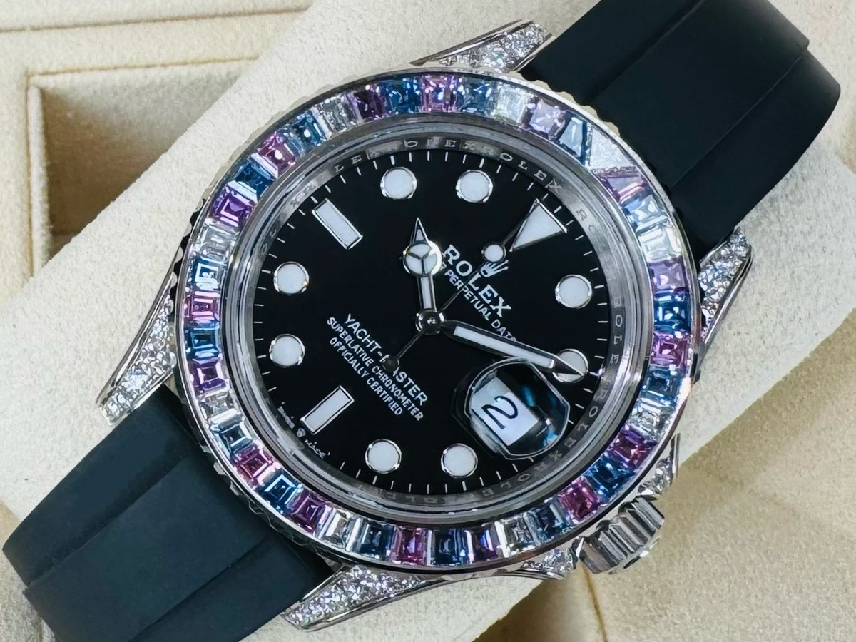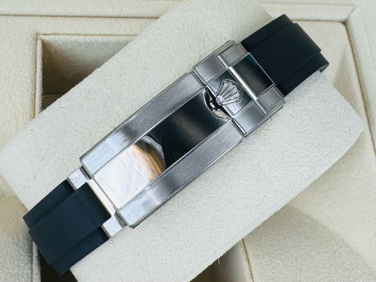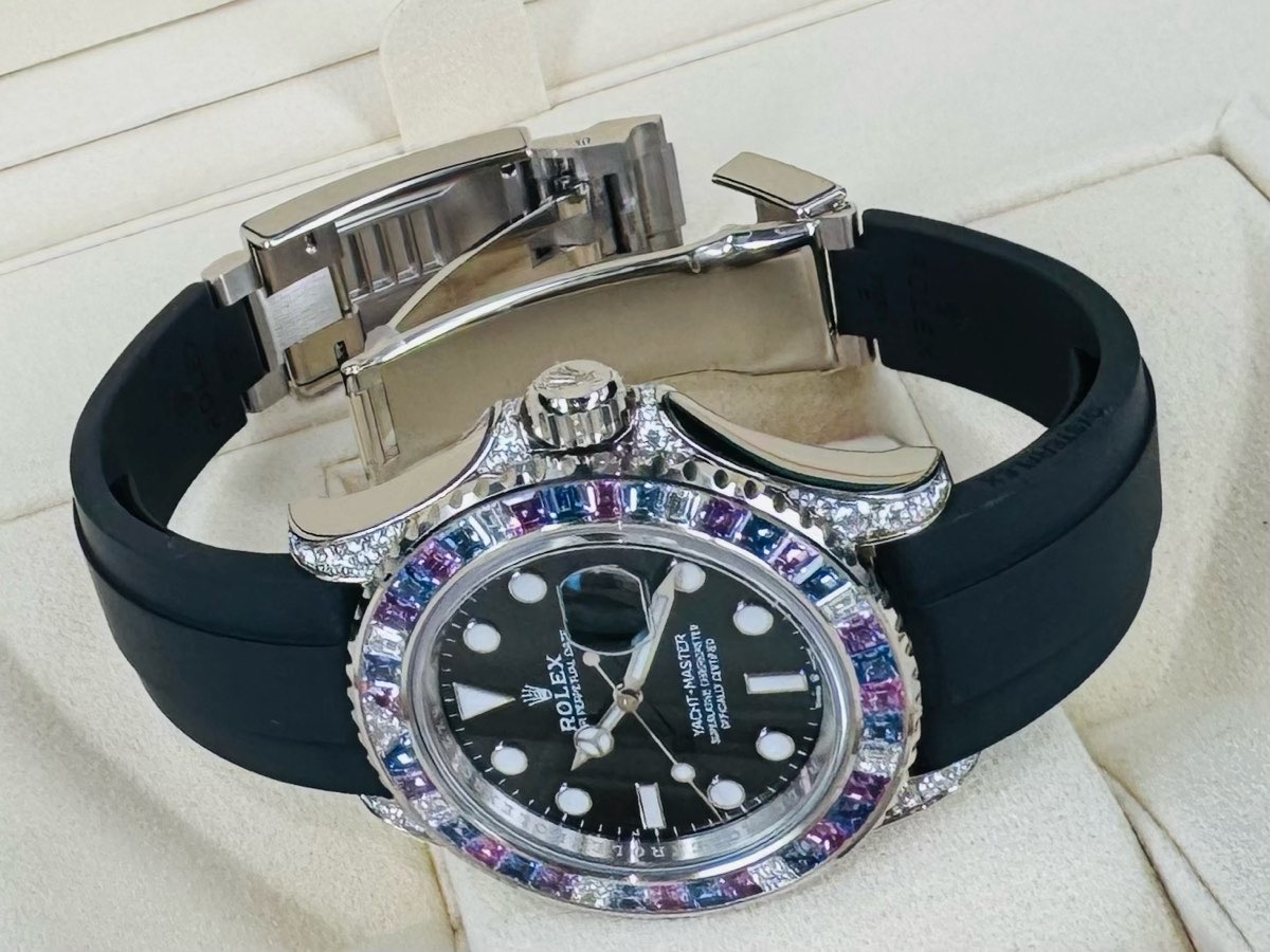 18k白金材質錶殼、錶帶、摺疊扣、旋入式錶冠 / 原鑲彩鑽刻度雙向旋轉錶框/ Oysterflex黑色橡膠錶帶 / 夜光時標及賓士指針 / 藍寶石水晶玻璃鏡面 |
