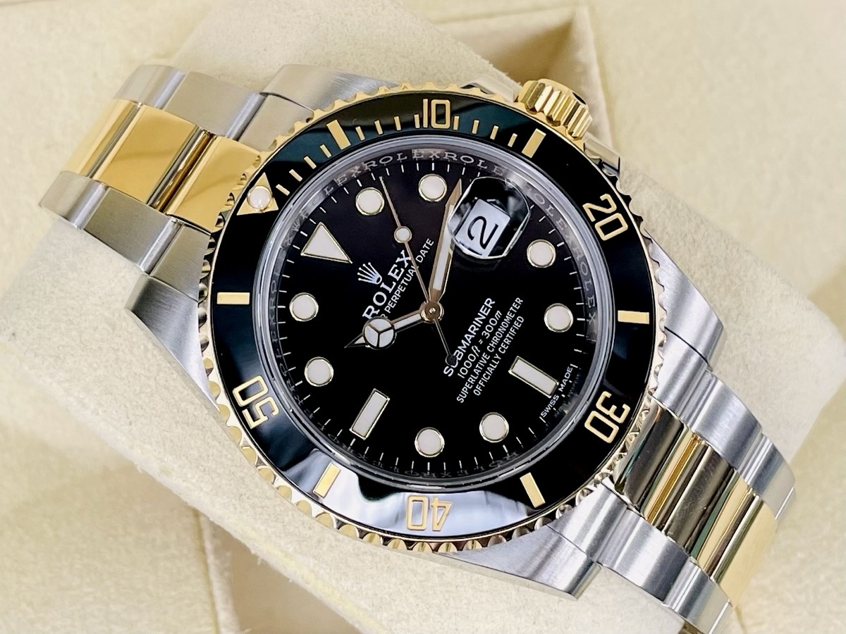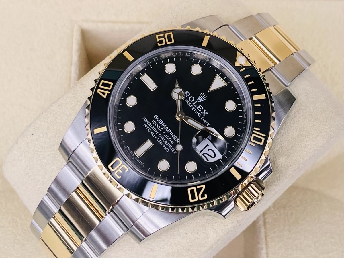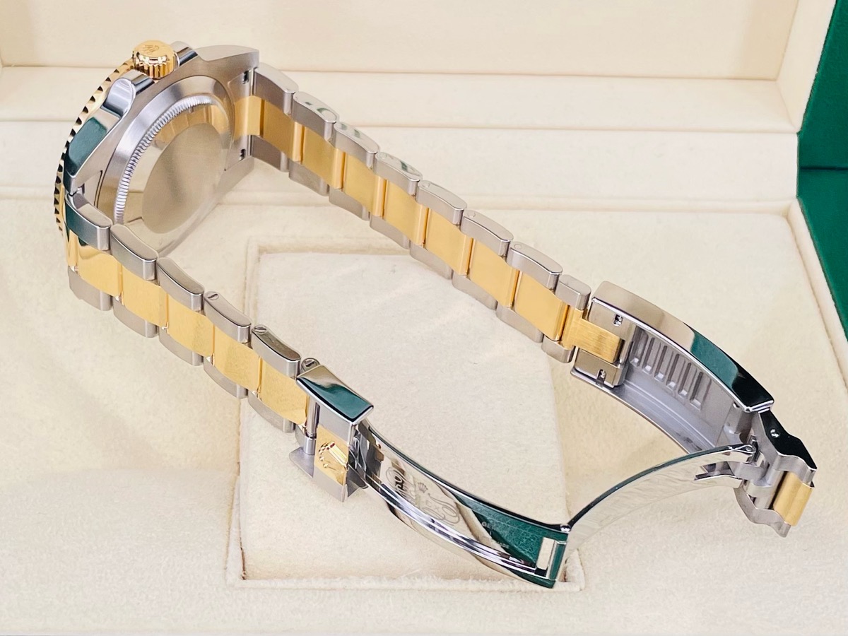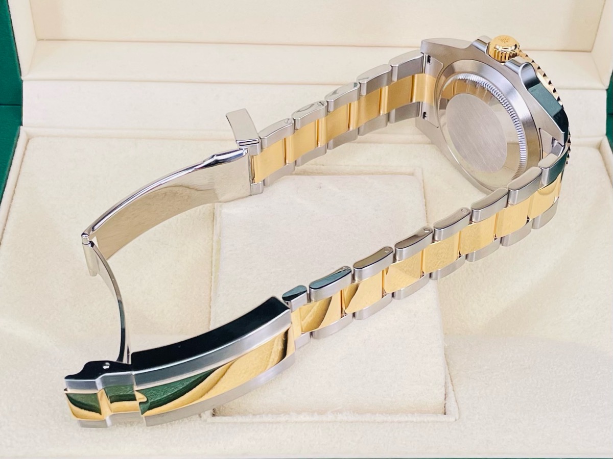 18K黃金材質+精鋼材質錶殼、錶帶及折疊帶扣 / 黑色陶瓷單向旋轉錶圈 / 夜光指針及時標 / 藍寶石水晶玻璃鏡面
