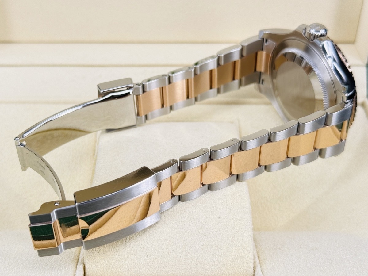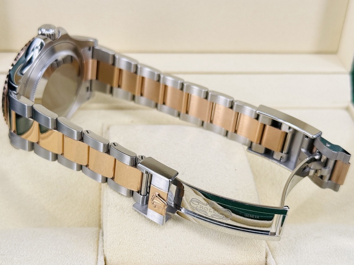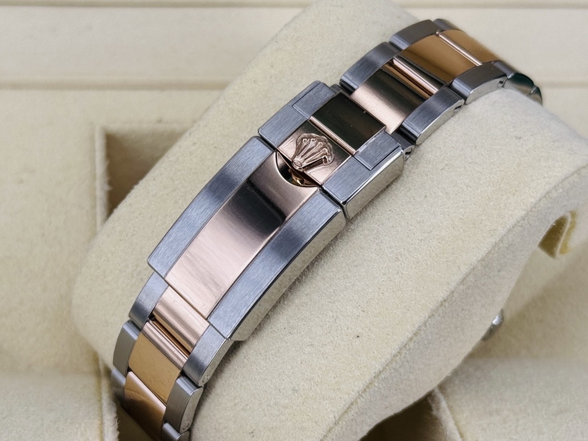 不鏽鋼材質錶殼 / 玫瑰金材質雙向旋轉錶圈、旋入式錶冠 / 玫瑰金半金錶鍊帶及蠔式折疊帶扣 / 巧克力色放射紋面盤 / 夜光時標及賓士指針 / 藍寶石水晶玻璃鏡面