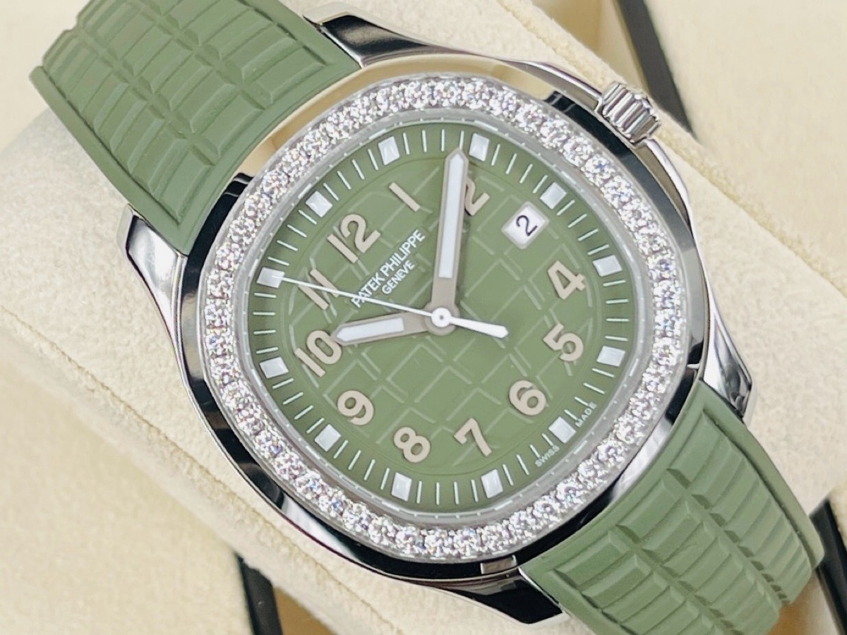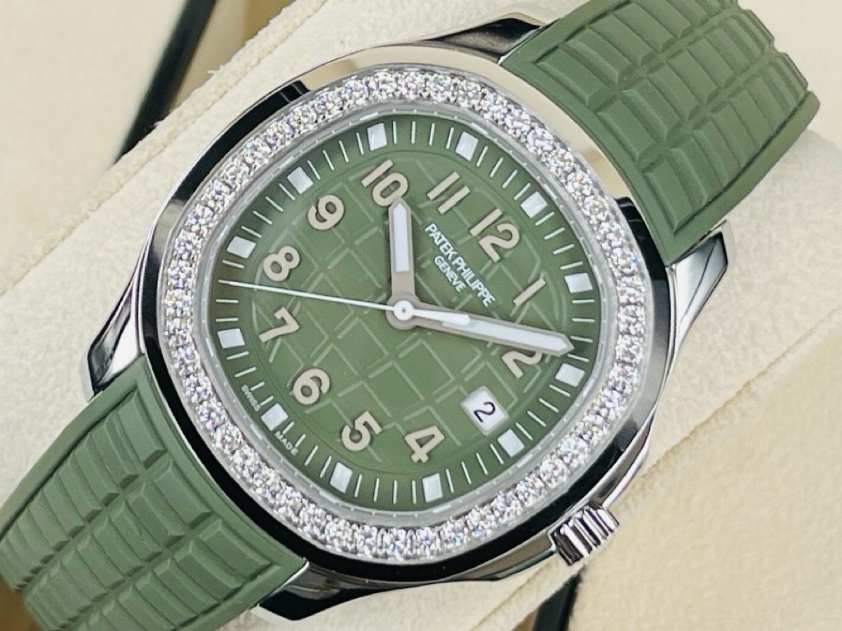 不鏽鋼材質錶殼、摺疊扣、旋入式錶冠 / 原鑲鑽圈(48顆鑽石:約1.11克拉) / 夜光指針 / 立體阿拉伯數字時標 / 原廠卡其綠色橡膠錶帶 / 藍寶石水晶玻璃鏡面