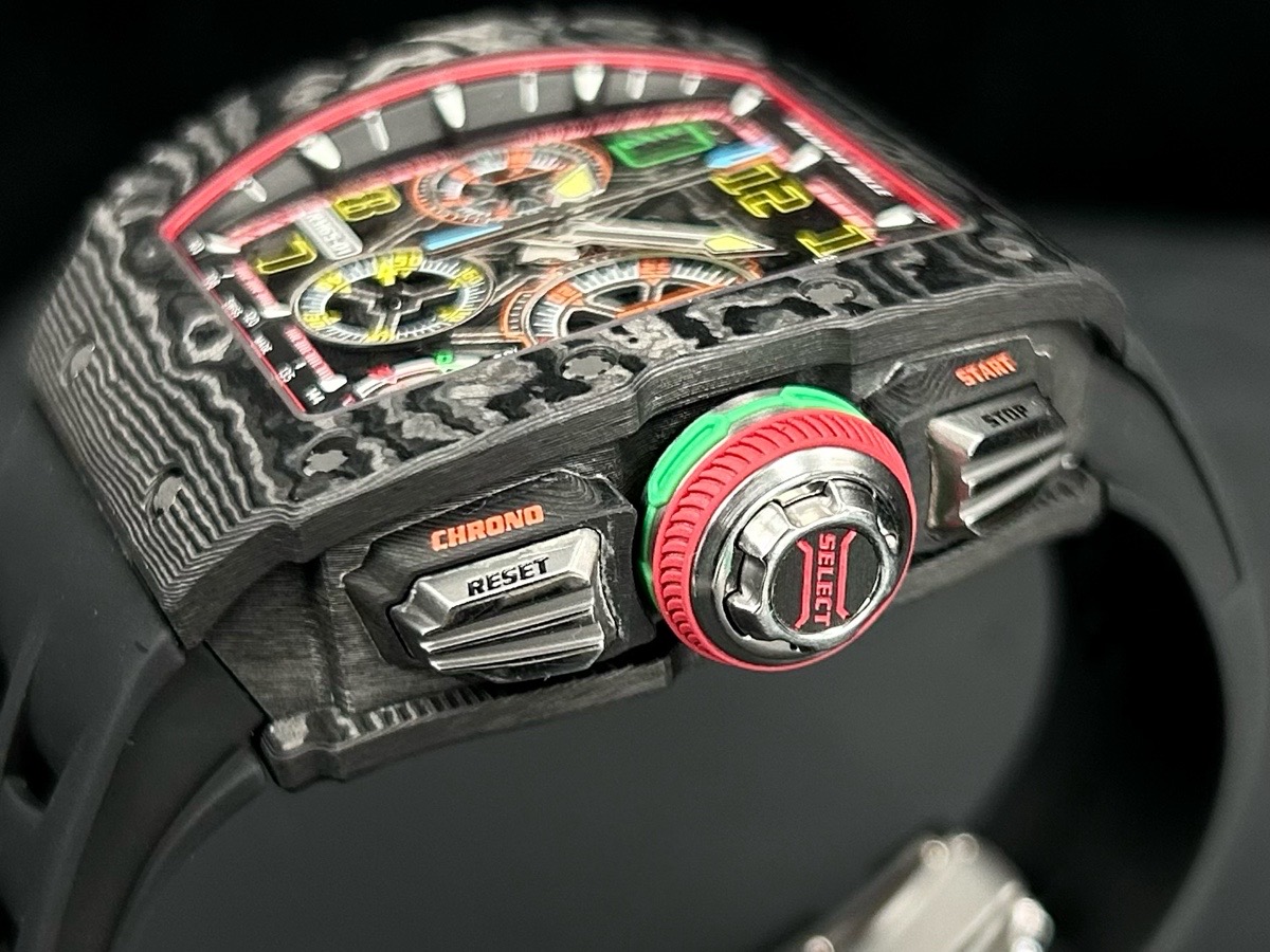 另一項里程碑的創舉是RICHARD MILLE開發的首款自製專利快速上鍊裝置,只需在8點鐘位置的按鈕上按壓125次,發條盒即可完全上鍊,並隨時準備好為重要事件計時。RICHARD MILLE的工程師形容這項實用功能「非常有趣」,由於這種上鍊方式對扭矩傳遞水準要求非常高,因而開發過程尤為艱難。