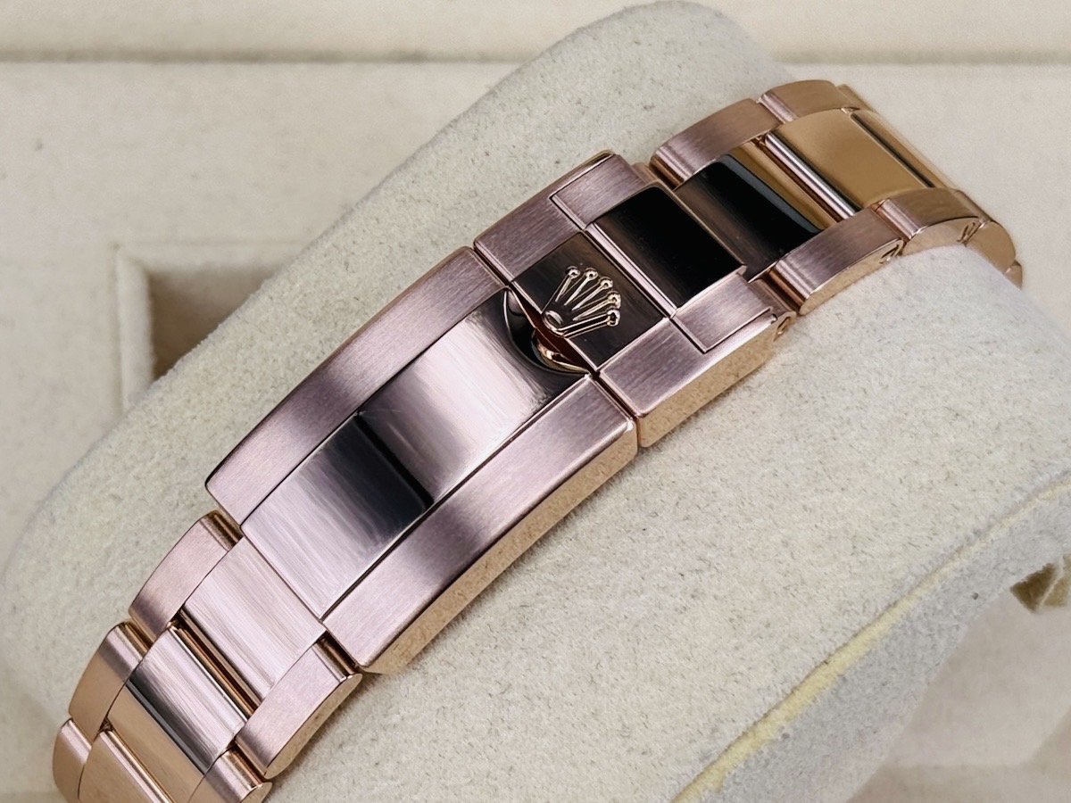 玫瑰金材質錶殼、錶鍊帶及單邊折疊扣 / 夜光指針及時標 / 18K玫瑰金視距儀刻度錶圈 / 旋入式錶冠 / 藍寶石水晶玻璃 / 防偽內圈
