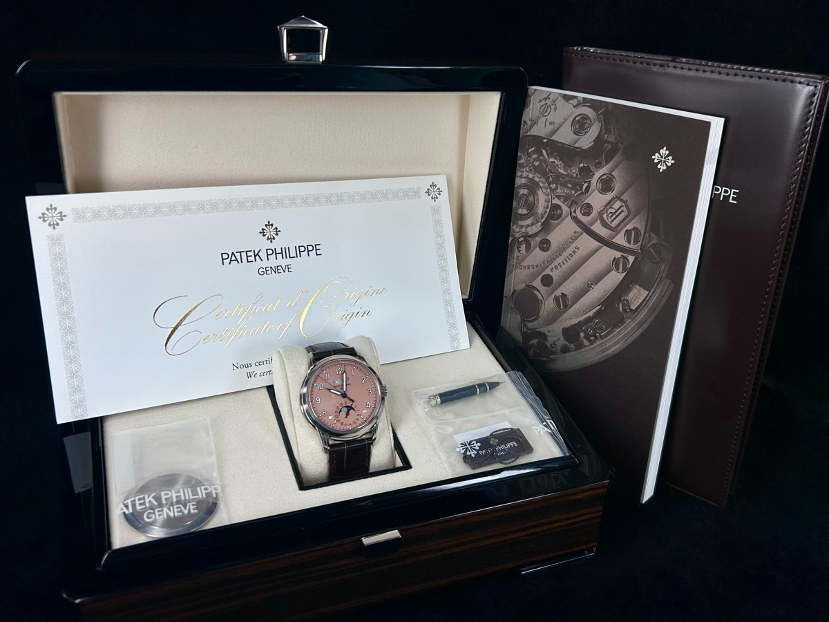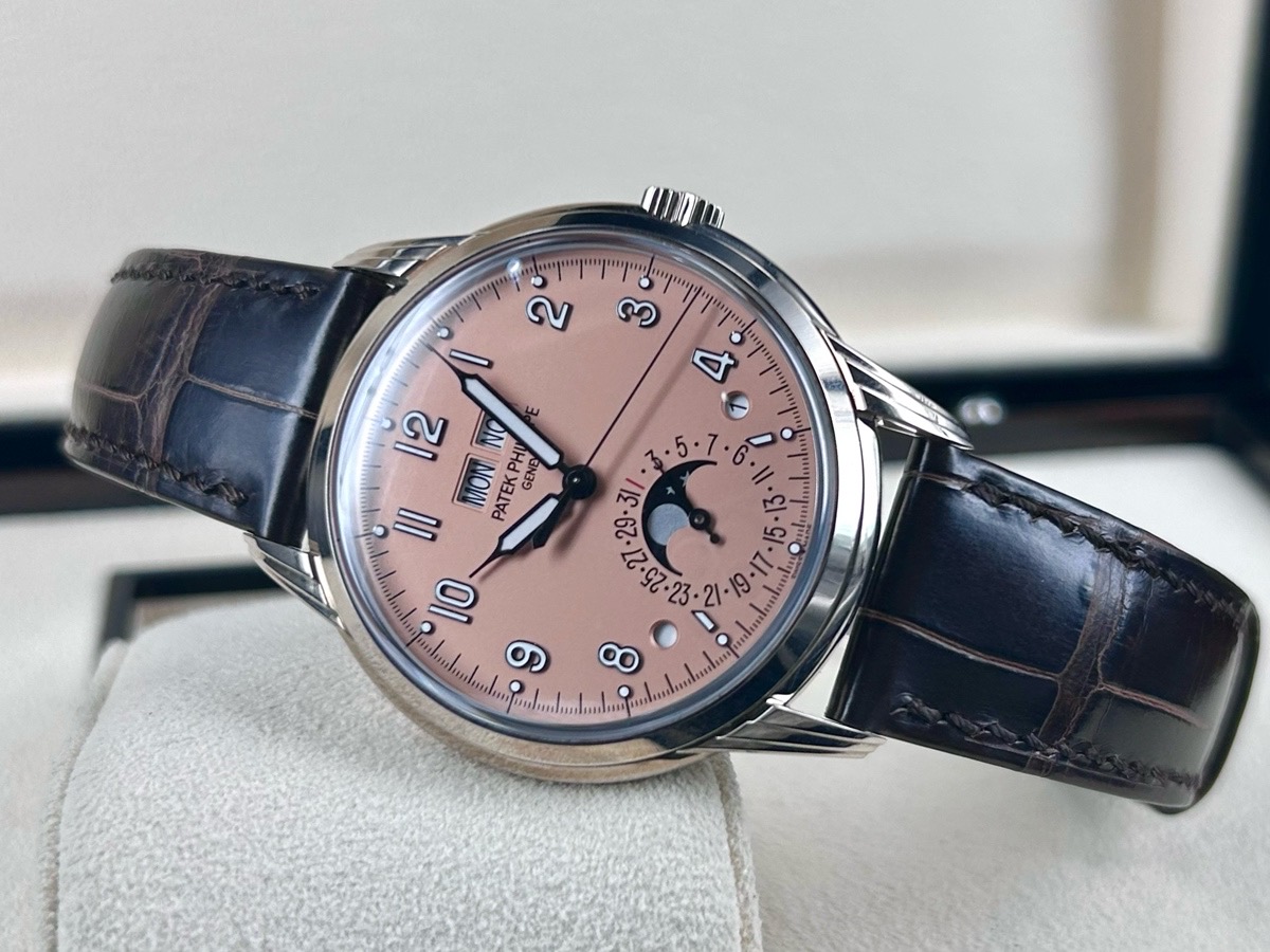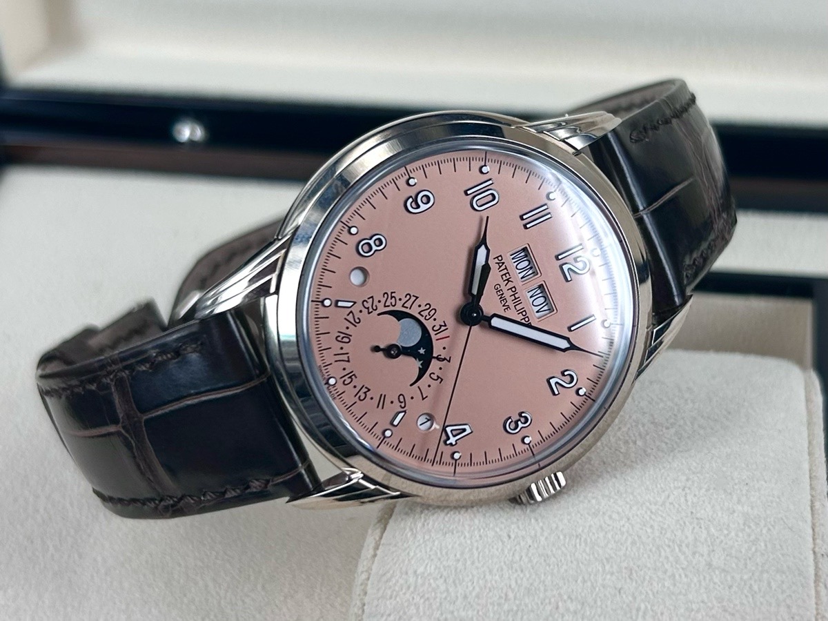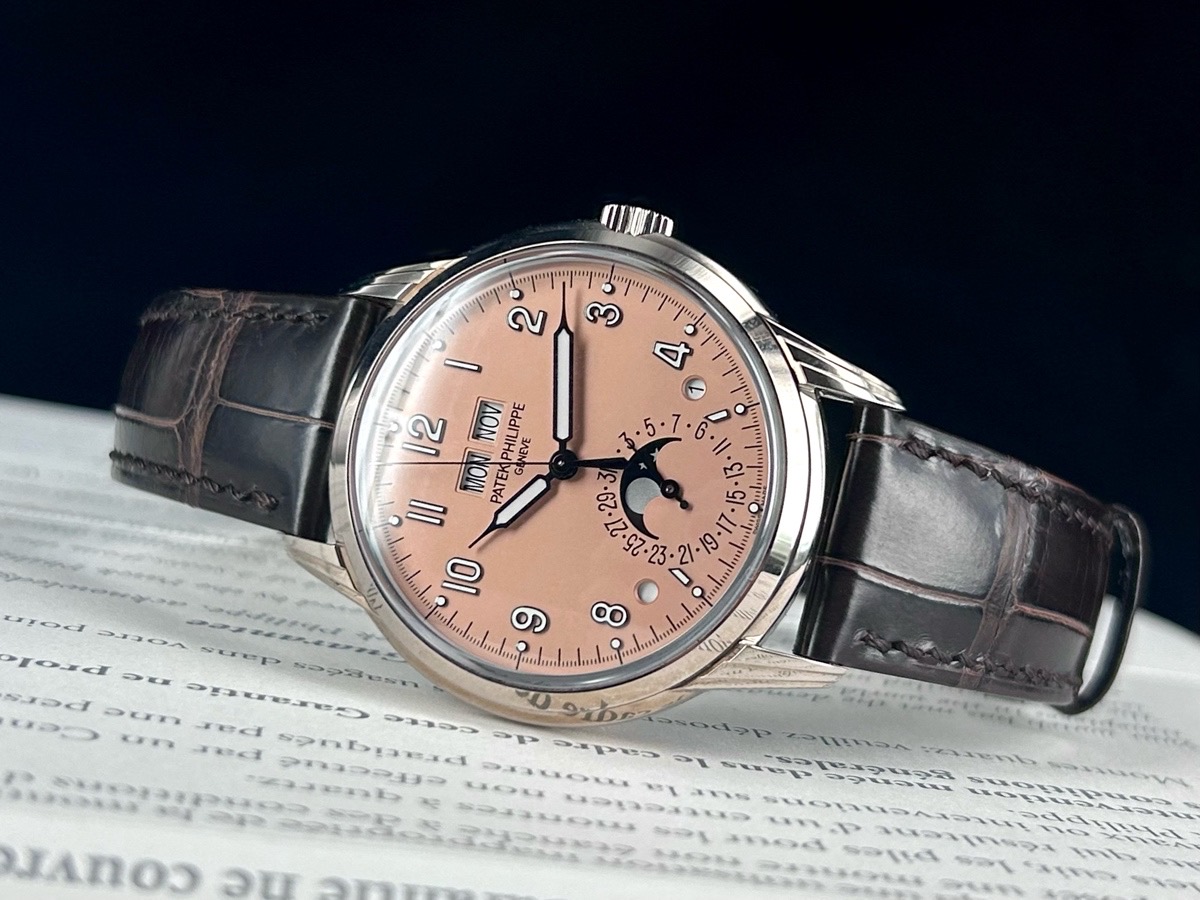 | Patek Philippe 百達翡麗 PP錶 5320G 鮭魚面盤 傳奇腕錶 造型時尚復古 機芯由白金錶殼保護 三層耳設計 經典永恆的藝術傑作 除了能正確顯示28、30及31日月份的日期 更能顯示四年一遇的閨日2月29日 2023年保單 |