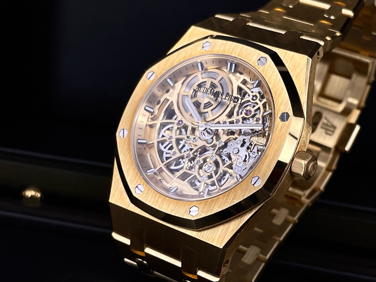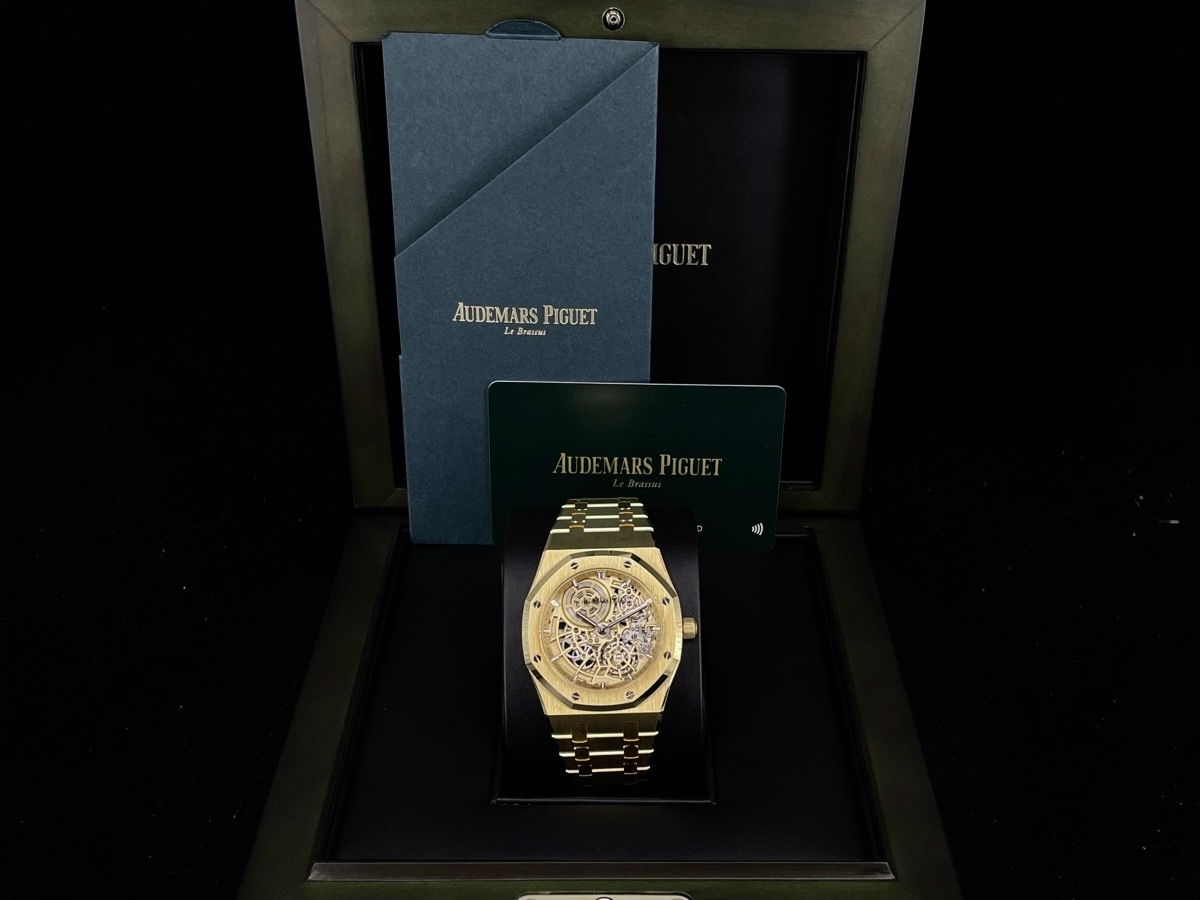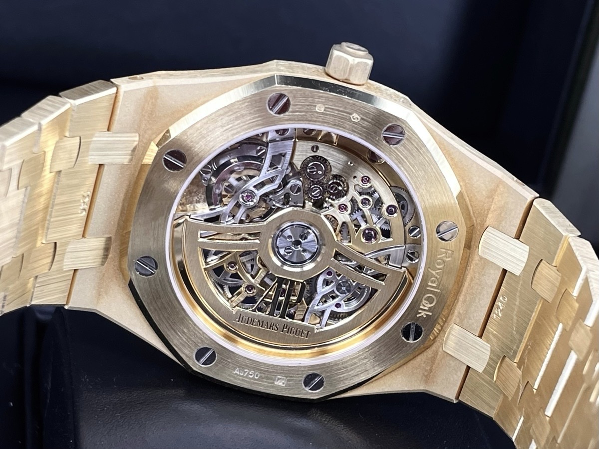 Audemars Piguet 愛彼 AP錶 Royal Oak 皇家橡樹系列 <font color=「JUMBO」超薄鏤空腕錶 16204BA.OO.1240BA.01 18K黃金錶殼 金色鏤空機芯 2024年保卡 ">